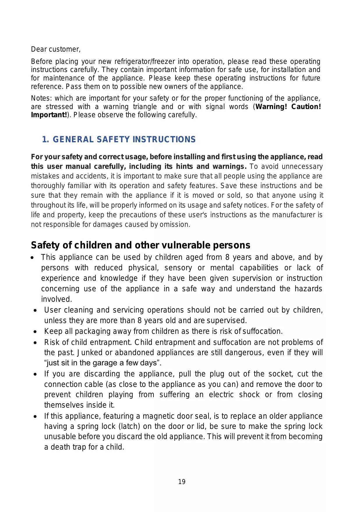 Instructions de sécurité Attention : Ne pas utiliser de dispositifs mécaniques ou d'autres moyens pour accélérer le processus de dégivrage, autres que ceux recommandés par le fabricant. Attention : N’obstruer aucune grille de ventilation de l’appareil. Attention : Ne pas stocker de substances explosives comme les bombes d'aérosol avec un propulseur inflammables dans cet appareil. Attention : Ne pas endommager le circuit frigorifique de l’appareil. Attention : Les unités de réfrigération fonctionnant avec de l'isobutane (R600a), elles ne peuvent être placées dans une zone avec des sources d'ignition (par exemple, descellé contacts électriques ou lorsque le fluide frigorigène pourrait rassembler en cas de fuite). Le type de fluide frigorigène est indiqué sur la plaque signalétique de l’armoire. Attention : Ne pas utiliser d'appareils électriques dans les Compartiments de l'appareil, sauf si elles sont du type recommandé par le fabricant.