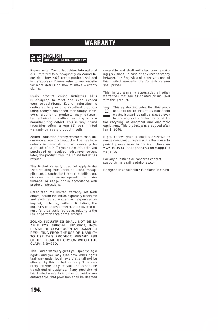 OF THE LEGAL THEORY ON WHICH THE CLAIM IS BASED. This limited warranty gives you specific legal rights, and you may also have other rights that vary under local laws that shall not be affected by this limited warranty. This warranty extends only to you and cannot be transferred or assigned. If any provision of this limited warranty is unlawful, void or unenforceable, that provision shall be deemed severable and shall not affect any remaining provisions. In case of any inconsistency between the English and other versions of this limited warranty, the English version shall prevail. This limited warranty supersedes all other warranties that are associated or included with this product. This symbol indicates that this product shall not be treated as household waste. Instead it shall be handed over to the applicable collection point for the recycling of electrical and electronic equipment. This product was produced after Jan 1, 2006. If you believe your product is defective or needs servicing or repair within the warranty period, please refer to the instructions on w w w. m a r s h a l l h e a d p h o n e s . c o m / s u p p o r t / warranty. For any questions or concerns contact support@marshallheadphones.com. Designed in Stockholm • Produced in China WARRANTY FRANÇAIS