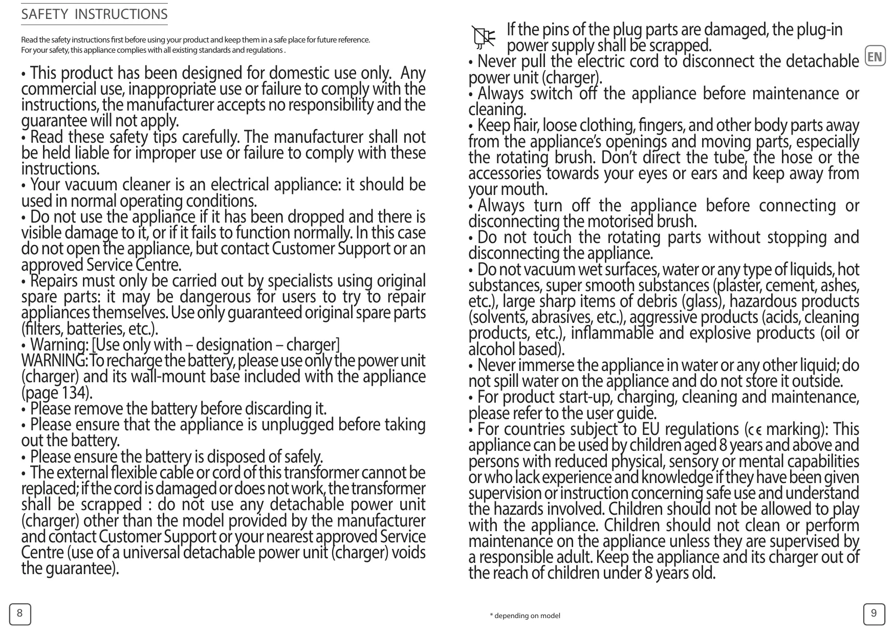 • Eloignez les cheveux, les vêtements amples, les doigts et toute autre partie du corps des ouvertures et des pièces mobiles de l’appareil, notamment de la brosse rotative. Ne dirigez pas le flexible*, le tube ou les accessoires vers les yeux ou les oreilles et ne les portez pas à la bouche. • Eteignez toujours l’appareil avant de brancher ou de débrancher la brosse motorisée. • Ne touchez pas aux parties rotatives sans avoir arrêté et débranché l’aspirateur. • N’aspirez pas de surfaces mouillées, d’eau ou de liquides quelle que soit leur nature, de substances chaudes, de substances ultrafines (plâtre, ciment, cendres...), de gros débris tranchants (verre), de produits nocifs (solvants, décapants...), agressifs (acides, nettoyants...), inflammables et explosifs (à base d’essence ou d’alcool). • Ne plongez jamais l’appareil dans l’eau, ne projetez pas d’eau sur l’appareil et ne l’entreposez pas à l’extérieur. • Pour la mise en marche, la mise en charge, le nettoyage et la maintenance du produit se reporter au guide d’utilisation. • Pour les pays soumis aux réglementations Européennes (marquage ) : Cet appareil peut être utilisé par des enfants âgés de 8 ans et plus et les personnes manquant d’expérience et de connaissances ou dont les capacités physiques, sensorielles ou mentales sont réduites, si elles ont été formées et encadrées quant à l’utilisation de manière sûre et connaissent les risques encourus. Les enfants ne doivent pas jouer avec l’appareil. Le nettoyage et l’entretien par l’utilisateur ne doit pas être fait par des enfants sans surveillance. Tenir l’appareil et son unité d’alimentation amovible (chargeur) hors de la portée des enfants de moins de 8 ans. * selon modèle
