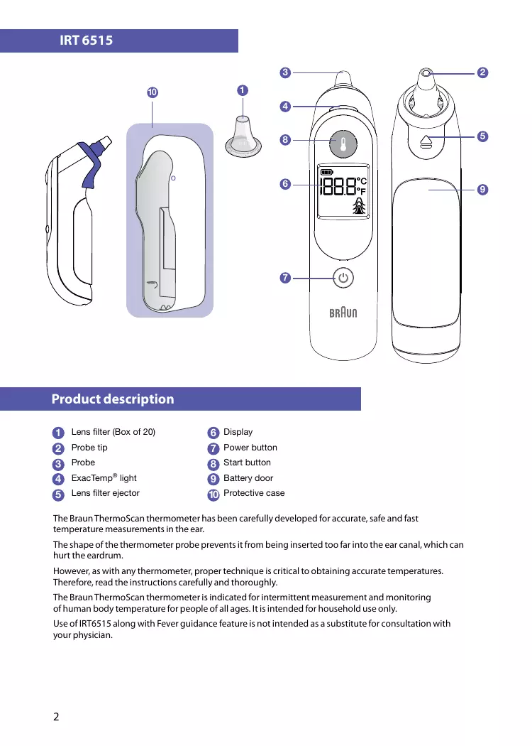 Lens filter ejector 10 Protective case The Braun ThermoScan thermometer has been carefully developed for accurate, safe and fast temperature measurements in the ear. The shape of the thermometer probe prevents it from being inserted too far into the ear canal, which can hurt the eardrum. However, as with any thermometer, proper technique is critical to obtaining accurate temperatures. Therefore, read the instructions carefully and thoroughly. The Braun ThermoScan thermometer is indicated for intermittent measurement and monitoring of human body temperature for people of all ages. It is intended for household use only. Use of IRT6515 along with Fever guidance feature is not intended as a substitute for consultation with your physician.