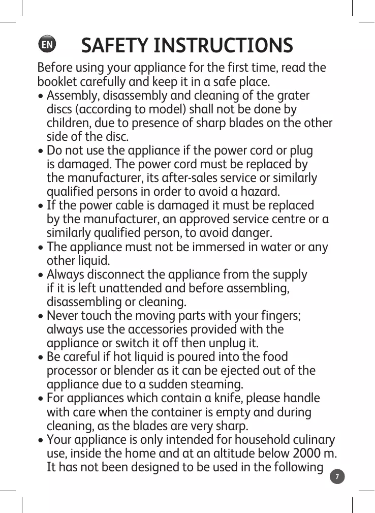 N’utilisez pas l’appareil si la prise ou le câble d’alimentation est endommagé. Si le câble d’alimentation est endommagé, il doit être remplacé par le fabricant, son service après-vente ou une personne de qualification similaire afin d’éviter tout danger. • S i le câble d’alimentation est endommagé, il doit être remplacé par le fabricant, son Centre Service Agréé ou une personne de qualification similaire afin d’éviter tout danger. • L’appareil ne doit pas être immergé dans l’eau ou tout autre liquide. • Débranchez toujours l’appareil de la prise électrique avant de le laisser sans surveillance, de le nettoyer ou de l’assembler / démonter. • Ne touchez jamais les parties en mouvement avec vos doigts, utilisez toujours les accessoires fournis avec l’appareil ou éteignez-le puis débranchez-le. • Restez vigilant(e) si un liquide chaud est versé dans le robot ménager ou le mixeur dans la mesure où il peut être éjecté de l’appareil en raison d’une ébullition soudaine. • Pour les appareils possédant un couteau, manipulez-le avec précaution, lorsque le contenant est vidé et lors du nettoyage car les lames sont très coupantes. • Votre appareil est destiné uniquement à un usage domestique culinaire, à l’intérieur de la maison et à une 4