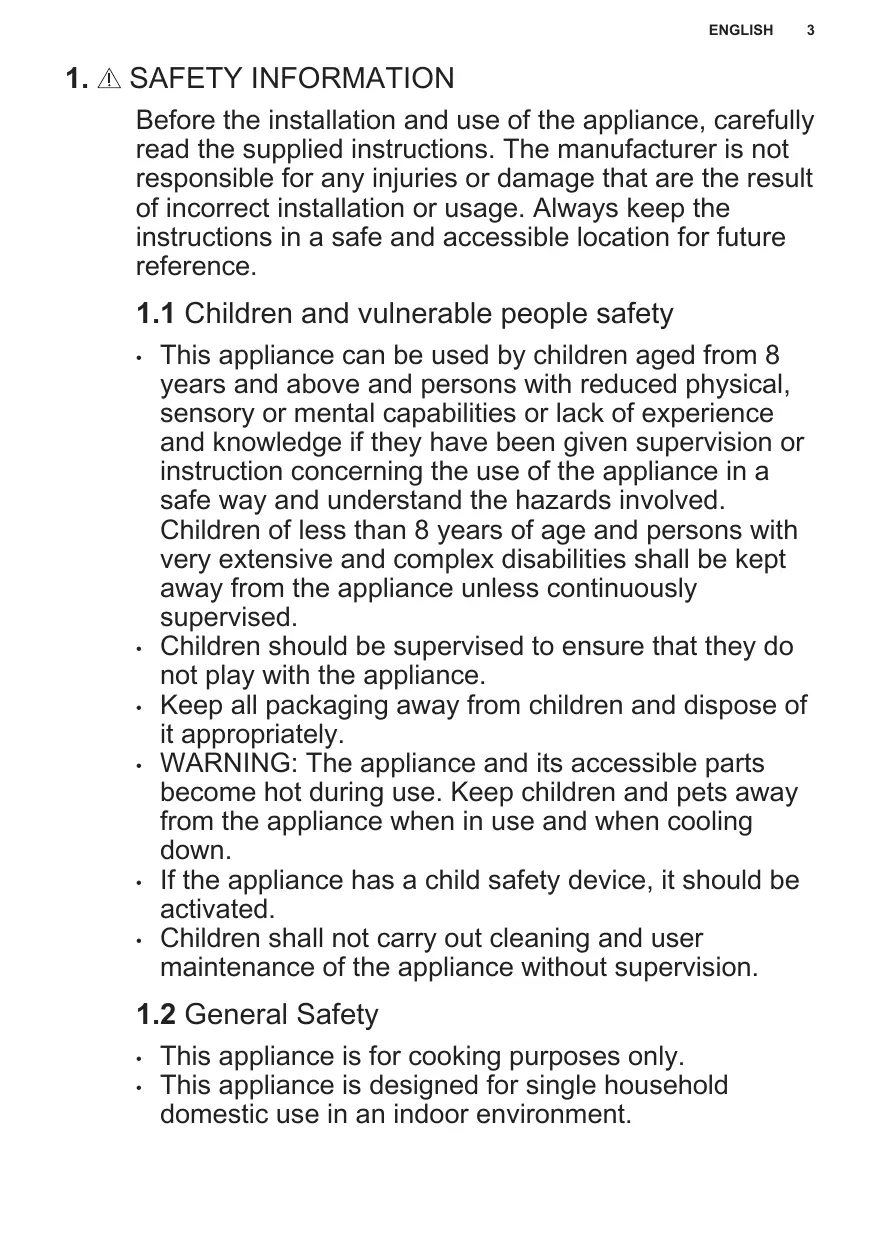 This appliance can be used by children aged from 8 years and above and persons with reduced physical, sensory or mental capabilities or lack of experience and knowledge if they have been given supervision or instruction concerning the use of the appliance in a safe way and understand the hazards involved. Children of less than 8 years of age and persons with very extensive and complex disabilities shall be kept away from the appliance unless continuously supervised. Children should be supervised to ensure that they do not play with the appliance. Keep all packaging away from children and dispose of it appropriately. WARNING: The appliance and its accessible parts become hot during use. Keep children and pets away from the appliance when in use and when cooling down. If the appliance has a child safety device, it should be activated. Children shall not carry out cleaning and user maintenance of the appliance without supervision.