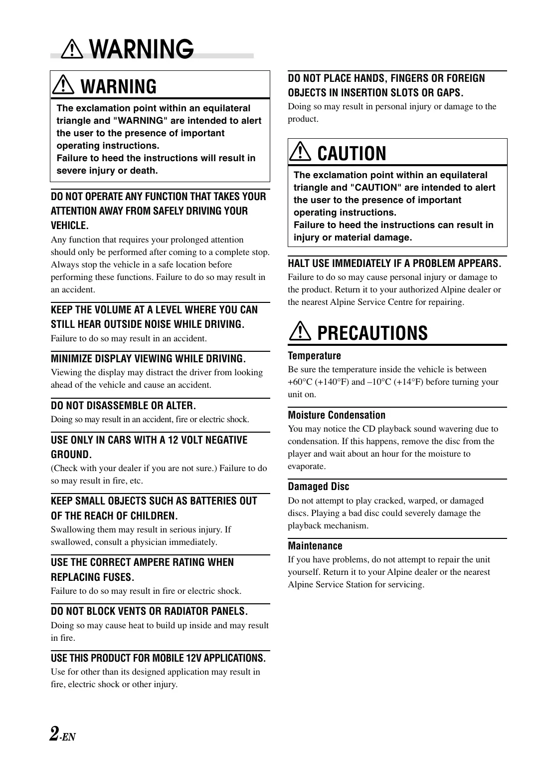 VEHICLE. Any function that requires your prolonged attention should only be performed after coming to a complete stop. Always stop the vehicle in a safe location before performing these functions. Failure to do so may result in an accident. KEEP THE VOLUME AT A LEVEL WHERE YOU CAN STILL HEAR OUTSIDE NOISE WHILE DRIVING. Failure to do so may result in an accident. DO NOT PLACE HANDS, FINGERS OR FOREIGN OBJECTS IN INSERTION SLOTS OR GAPS. Doing so may result in personal injury or damage to the product. CAUTION The exclamation point within an equilateral triangle and "CAUTION" are intended to alert the user to the presence of important operating instructions. Failure to heed the instructions can result in injury or material damage. HALT USE IMMEDIATELY IF A PROBLEM APPEARS. Failure to do so may cause personal injury or damage to the product. Return it to your authorized Alpine dealer or the nearest Alpine Service Centre for repairing. PRECAUTIONS MINIMIZE DISPLAY VIEWING WHILE DRIVING. Temperature Viewing the display may distract the driver from looking ahead of the vehicle and cause an accident. Be sure the temperature inside the vehicle is between +60°C (+140°F) and –10°C (+14°F) before turning your unit on. DO NOT DISASSEMBLE OR ALTER. Doing so may result in an accident, fire or electric shock. Moisture Condensation USE ONLY IN CARS WITH A 12 VOLT NEGATIVE GROUND. You may notice the CD playback sound wavering due to condensation. If this happens, remove the disc from the player and wait about an hour for the moisture to evaporate. (Check with your dealer if you are not sure.) Failure to do so may result in fire, etc. KEEP SMALL OBJECTS SUCH AS BATTERIES OUT OF THE REACH OF CHILDREN. Swallowing them may result in serious injury. If swallowed, consult a physician immediately.