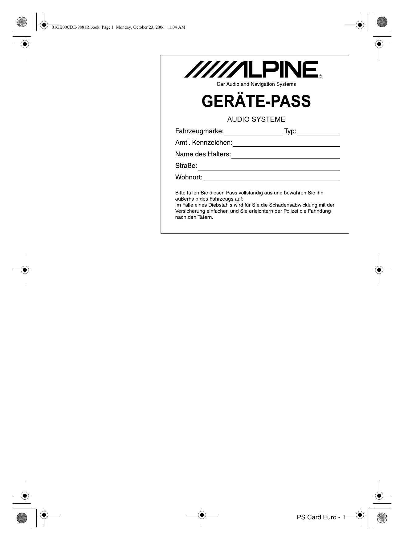 - Consultez votre revendeur Alpine pour plus de détails sur les mesures de prévention contre les parasites. 29-FR 01FR06CDE-9881R.fm ALPINE CDE-9881R 68-08564Z05-A (FR) 01FR00CDE-9881R.book Page 30 Monday, October 23, 2006 10:03 AM 01GB00CDE-9881R.book Page 2 Monday, October 23, 2006 11:04 AM 01GB02CDE-9881R.fm ALPINE CDE-9881R 68-08564Z05-A (EN) 01GB00CDE-9881R.book Page 1 Monday, October 23, 2006 11:04 AM PS Card Euro - 1 01GB00CDE-9881R.book Page 2 Monday, October 23, 2006 11:04 AM PS Card Euro - 2 01GB00CDE-9881R.book Page 3 Monday, October 23, 2006 11:04 AM PS Card Euro - 3 01GB00CDE-9881R.book Page 4 Monday, October 23, 2006 11:04 AM Appendix Product Information Card Produkt-Informationskarte English Filling in this Product Information Card is voluntary. If you fill in this card and send it to Alpine, your data will be tabulated into reference data for future Alpine product development. In addition, in the future you may receive information about new products or Survey Mail requesting additional opinions about Alpine products or services. If you agree to the above term, please sign your name in the indicated space and return the card. Any additional comments or inquiries may be sent to : Person in charge of Customer Service department Alpine Electronics (Europe) GmbH. Frankfurter Ring 117, 80807 München, Germany Phone: +49-(0)89-32 42 640
