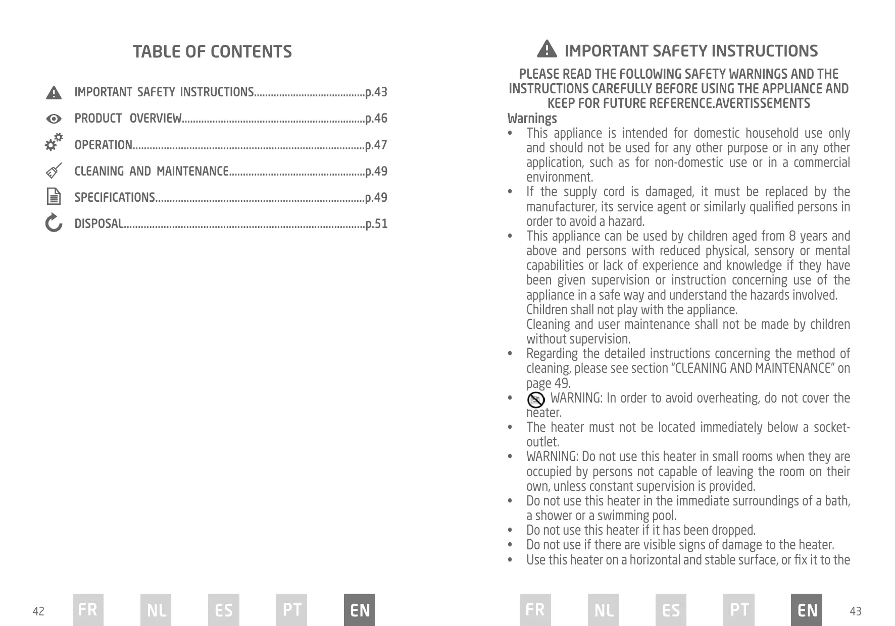 Toute utilisation autre que celle prévue pour cet appareil, ou pour une autre application que celle prévue, par exemple une application commerciale, est interdite. • Si le câble d’alimentation est endommagé, il doit être remplacé par le fabricant, son service après vente ou des personnes de qualification similaire afin d’éviter un danger. • Cet appareil peut être utilisé par des enfants âgés d’au moins 8 ans et par des personnes ayant des capacités physiques, sensorielles ou mentales réduites ou dénuées d’expérience ou de connaissance, s’ils (si elles) sont correctement surveillé(e)s ou si des instructions relatives à l’utilisation de l’appareil en toute sécurité leur ont été données et si les risques encourus ont été appréhendés. Les enfants ne doivent pas jouer avec l’appareil. Le nettoyage et l’entretien par l’usager ne doivent pas être effectués par des enfants sans surveillance. • En ce qui concerne la méthode du nettoyage, référez-vous à la section “NETTOYAGE ET ENTRETIEN” en page 08. • MISE EN GARDE: Pour éviter une surchauffe, ne pas couvrir l’appareil de chauffage. • L’appareil de chauffage ne doit pas être placé juste en dessous d’une prise de courant. • MISE EN GARDE : Ne pas utiliser cet appareil de chauffage dans des petits locaux, lorsqu’ils sont occupés par des personnes incapables de quitter le local seules, à moins qu’une surveillance constante ne soit prévue. • Ne pas utiliser cet appareil de chauffage à proximité d’une baignoire, d’une douche ou d’une piscine. • Ne pas utiliser cet appareil de chauffage s’il est tombé.