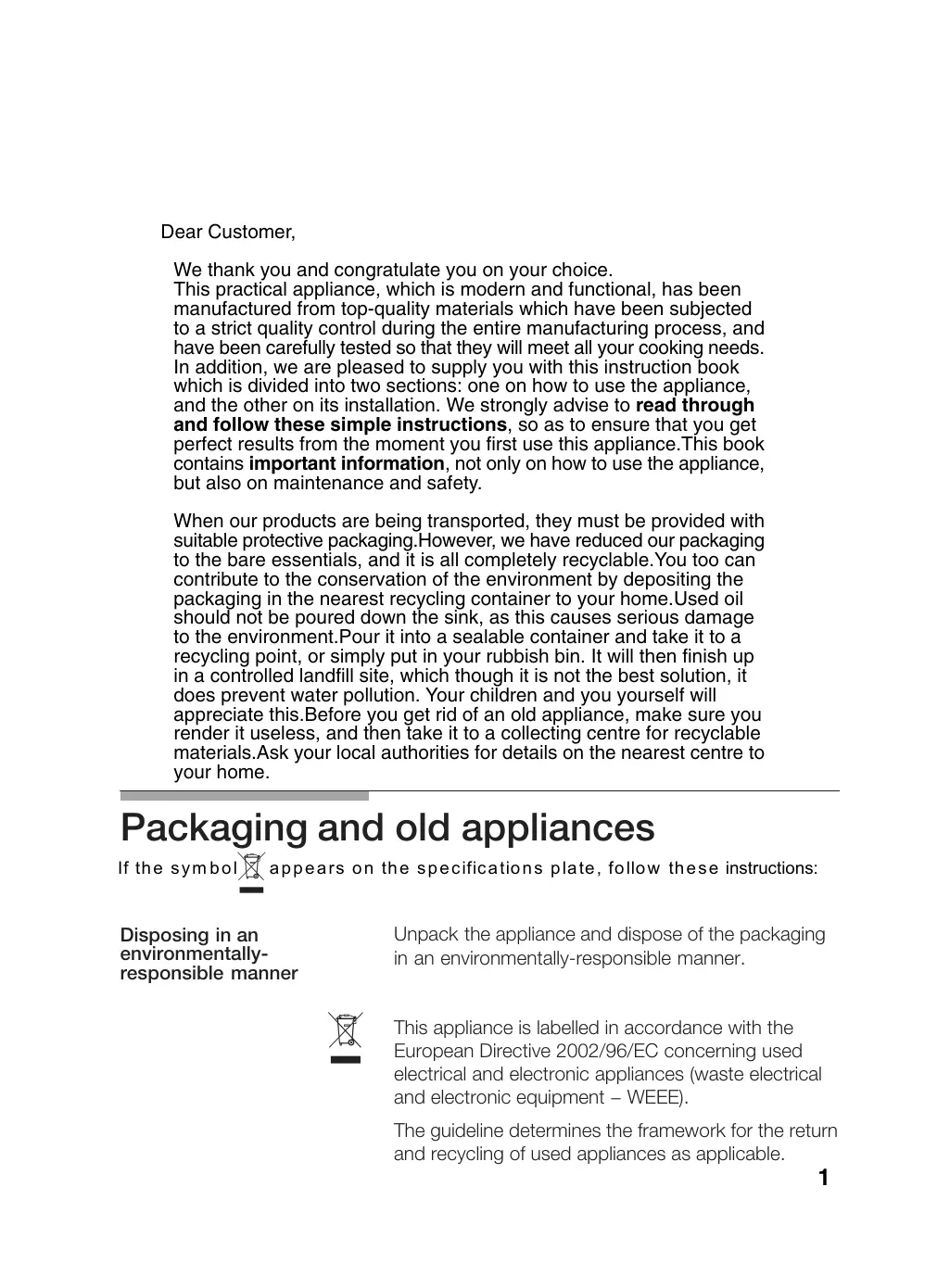 Dear Customer, We thank you and congratulate you on your choice. This practical appliance, which is modern and functional, has been manufactured from top-quality materials which have been subjected to a strict quality control during the entire manufacturing process, and have been carefully tested so that they will meet all your cooking needs. In addition, we are pleased to supply you with this instruction book which is divided into two sections: one on how to use the appliance, and the other on its installation. We strongly advise to read through and follow these simple instructions, so as to ensure that you get perfect results from the moment you first use this appliance.This book contains important information, not only on how to use the appliance, but also on maintenance and safety. When our products are being transported, they must be provided with suitable protective packaging.However, we have reduced our packaging to the bare essentials, and it is all completely recyclable.You too can contribute to the conservation of the environment by depositing the packaging in the nearest recycling container to your home.Used oil should not be poured down the sink, as this causes serious damage to the environment.Pour it into a sealable container and take it to a recycling point, or simply put in your rubbish bin. It will then finish up in a controlled landfill site, which though it is not the best solution, it does prevent water pollution. Your children and you yourself will appreciate this.Before you get rid of an old appliance, make sure you render it useless, and then take it to a collecting centre for recyclable materials.Ask your local authorities for details on the nearest centre to your home.