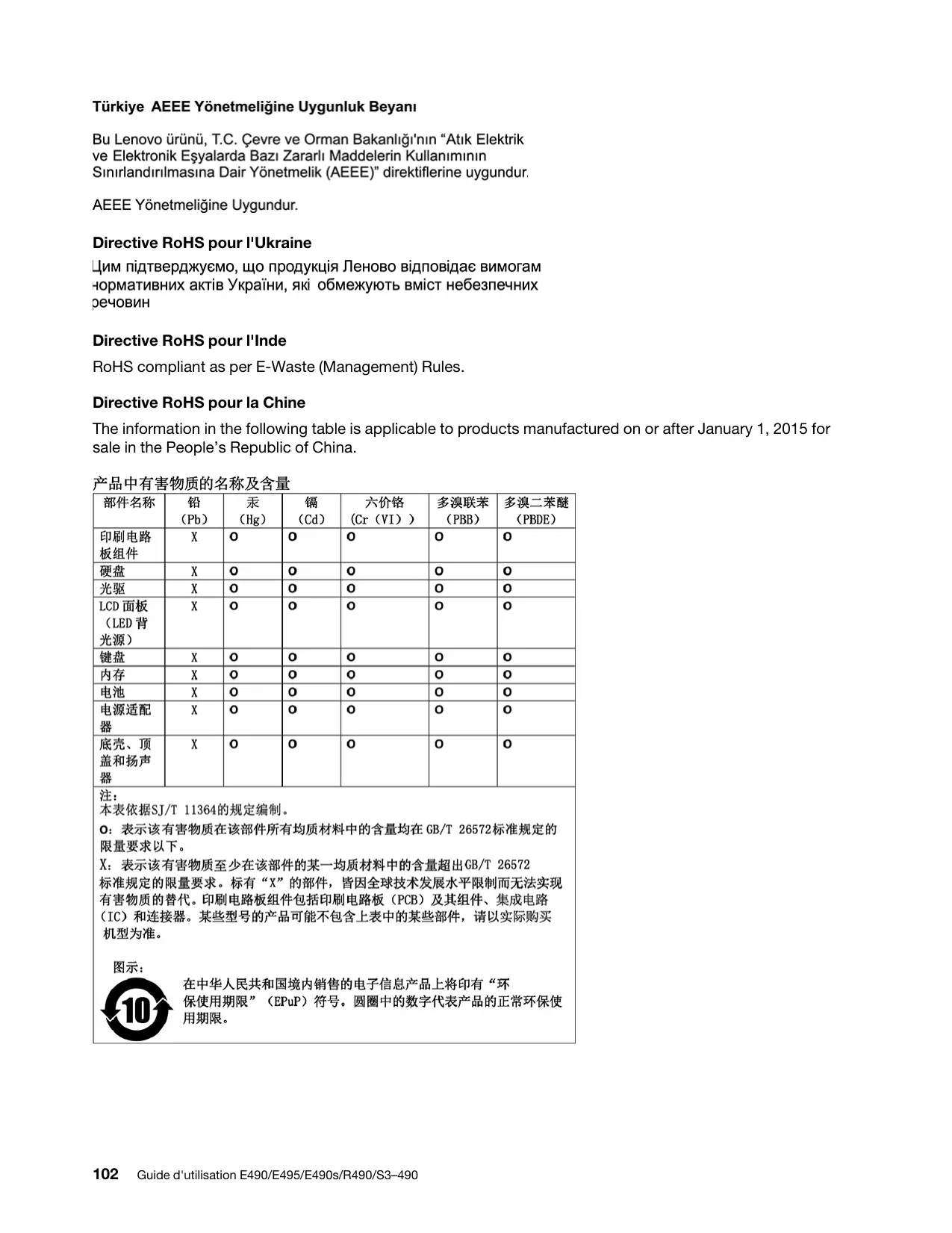 Directive RoHS pour la Turquie The Lenovo product meets the requirements of the Republic of Turkey Directive on the Restriction of the Use of Certain Hazardous Substances in Waste Electrical and Electronic Equipment (WEEE).