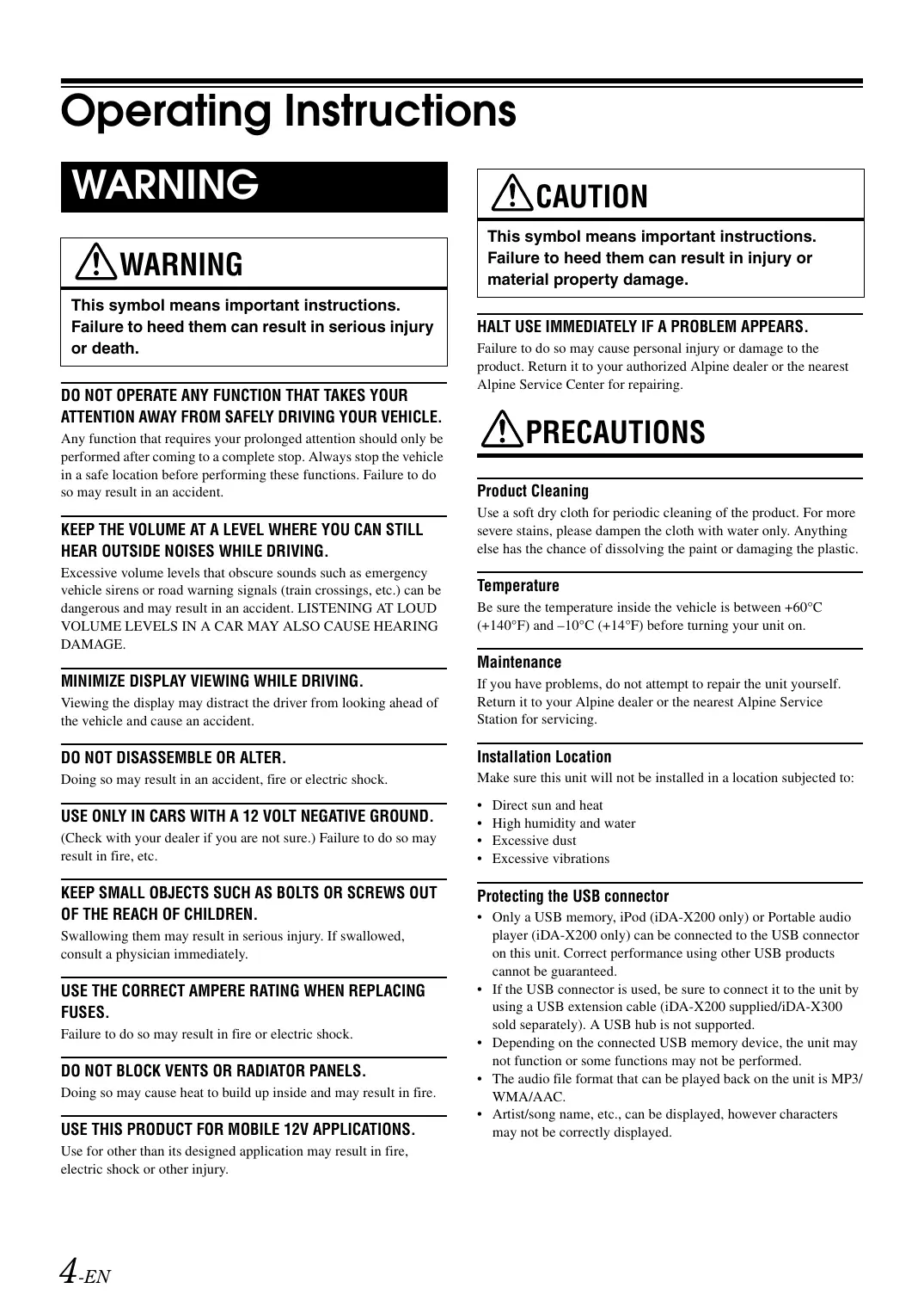 - Specifications ENGLISH Operating Instructions WARNING CAUTION This symbol means important instructions. Failure to heed them can result in injury or material property damage. WARNING This symbol means important instructions. Failure to heed them can result in serious injury or death. DO NOT OPERATE ANY FUNCTION THAT TAKES YOUR ATTENTION AWAY FROM SAFELY DRIVING YOUR VEHICLE. HALT USE IMMEDIATELY IF A PROBLEM APPEARS. Failure to do so may cause personal injury or damage to the product. Return it to your authorized Alpine dealer or the nearest Alpine Service Center for repairing. PRECAUTIONS Any function that requires your prolonged attention should only be performed after coming to a complete stop. Always stop the vehicle in a safe location before performing these functions. Failure to do so may result in an accident. Product Cleaning KEEP THE VOLUME AT A LEVEL WHERE YOU CAN STILL HEAR OUTSIDE NOISES WHILE DRIVING. Use a soft dry cloth for periodic cleaning of the product. For more severe stains, please dampen the cloth with water only. Anything else has the chance of dissolving the paint or damaging the plastic. Excessive volume levels that obscure sounds such as emergency vehicle sirens or road warning signals (train crossings, etc.) can be dangerous and may result in an accident. LISTENING AT LOUD VOLUME LEVELS IN A CAR MAY ALSO CAUSE HEARING DAMAGE. Temperature Be sure the temperature inside the vehicle is between +60°C (+140°F) and –10°C (+14°F) before turning your unit on. Maintenance MINIMIZE DISPLAY VIEWING WHILE DRIVING. Viewing the display may distract the driver from looking ahead of the vehicle and cause an accident. If you have problems, do not attempt to repair the unit yourself. Return it to your Alpine dealer or the nearest Alpine Service Station for servicing. DO NOT DISASSEMBLE OR ALTER. Installation Location Doing so may result in an accident, fire or electric shock. Make sure this unit will not be installed in a location subjected to: USE ONLY IN CARS WITH A 12 VOLT NEGATIVE GROUND. (Check with your dealer if you are not sure.) Failure to do so may result in fire, etc. KEEP SMALL OBJECTS SUCH AS BOLTS OR SCREWS OUT OF THE REACH OF CHILDREN. Swallowing them may result in serious injury. If swallowed, consult a physician immediately. USE THE CORRECT AMPERE RATING WHEN REPLACING FUSES. Failure to do so may result in fire or electric shock. DO NOT BLOCK VENTS OR RADIATOR PANELS. Doing so may cause heat to build up inside and may result in fire. USE THIS PRODUCT FOR MOBILE 12V APPLICATIONS. Use for other than its designed application may result in fire, electric shock or other injury. 4-EN p. 41