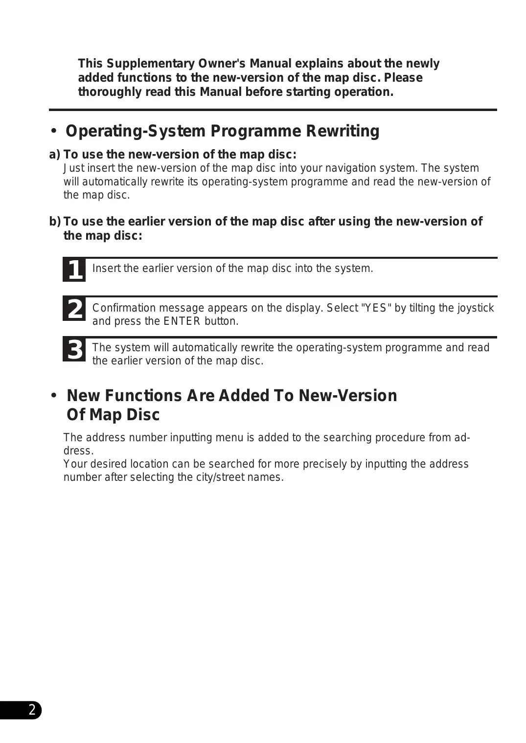 This Supplementary Owner's Manual explains about the newly added functions to the new-version of the map disc. Please thoroughly read this Manual before starting operation.