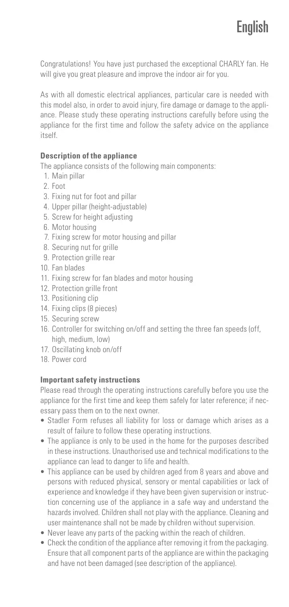 Download the instructions for your Fan in PDF format for free! Find your manual Charly Stand K - STADLER FORM and take your electronic device back in hand. On this page are published all the documents necessary for the use of your device. Charly Stand K by STADLER FORM.