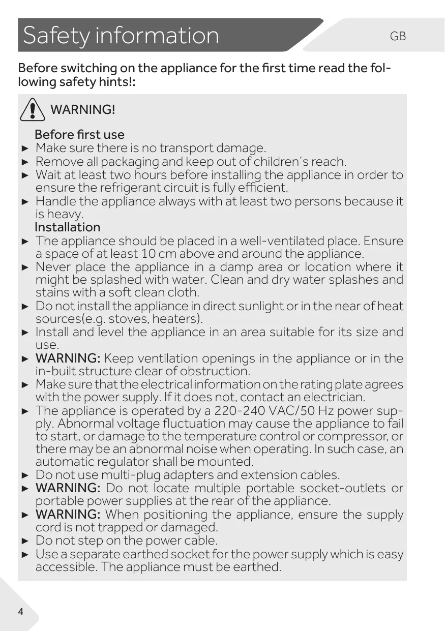 être éclaboussé d'eau. Nettoyez et séchez les éclaboussures d'eau et les taches avec un chiffon doux et propre. ► N’installez pas l'appareil en plein soleil ou à proximité de sources de chaleur (par ex. cuisinières, chauffages). ► Installez et mettez à niveau l'appareil dans une zone adaptée à sa taille et à son utilisation. ► AVERTISSEMENT : maintenez les ouvertures de ventilation situées dans l'appareil ou dans la structure encastrée libres de toute obstruction. ► Assurez-vous que les informations électriques figurant sur la plaque signalétique sont conformes à l'alimentation électrique. Si ce n'est pas le cas, contactez un électricien. ► L'appareil est alimenté par une alimentation de 220-240 VCA/50 Hz. Les variations anormales de tension peuvent provoquer l'arrêt de l'appareil ou endommager le régulateur de température ou le compresseur, ou il peut y avoir un bruit anormal lors du fonctionnement. Dans ce cas, un régulateur automatique doit être monté. ► N'utilisez pas d'adaptateurs multiprises ni de rallonges. ► AVERTISSEMENT : ne placez pas des systèmes multiprises portatifs ou des alimentations portatives à l’arrière de l’appareil. ► AVERTISSEMENT : lors du positionnement de l’appareil, vérifiez que le cordon d’alimentation n’est pas coincé ou abîmé. ► Ne marchez pas sur le câble d'alimentation. ► Utilisez une prise de terre séparée pour l'alimentation électrique qui est facile d'accès. L'appareil doit être mis à la terre.