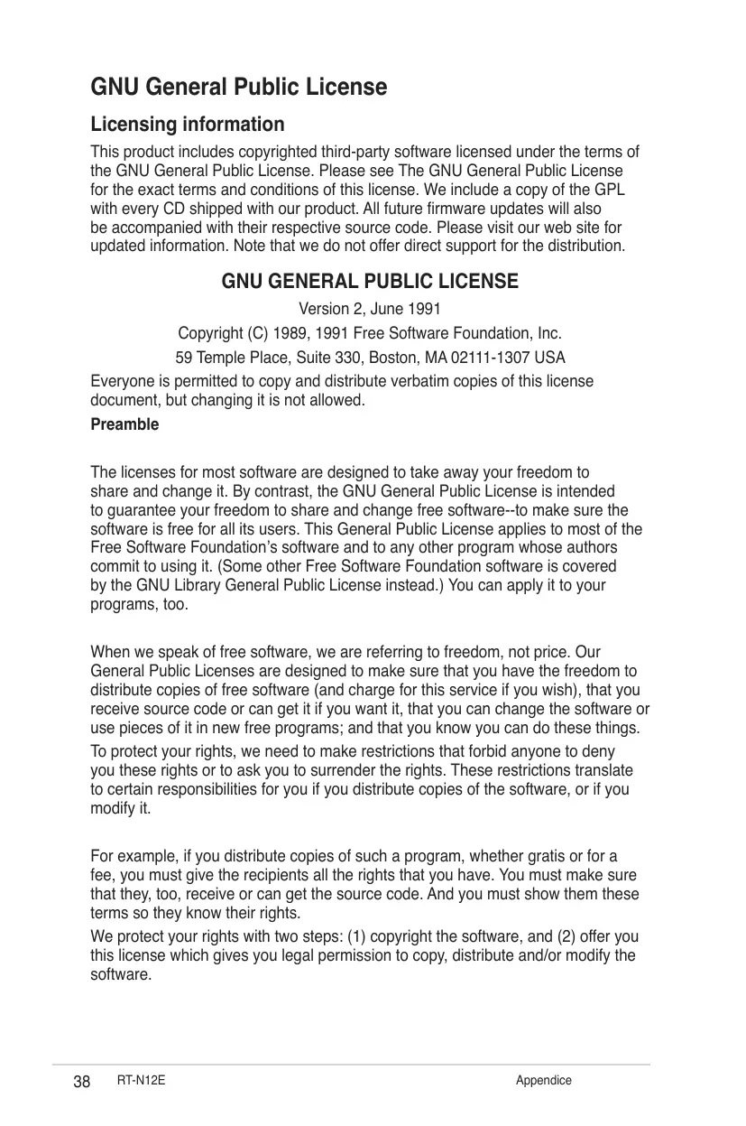 RT-N12E Appendice Also, for each author’s protection and ours, we want to make certain that everyone understands that there is no warranty for this free software. If the software is modified by someone else and passed on, we want its recipients to know that what they have is not the original, so that any problems introduced by others will not reflect on the original authors’ reputations. Finally, any free program is threatened constantly by software patents. We wish to avoid the danger that redistributors of a free program will individually obtain patent licenses, in effect making the program proprietary. To prevent this, we have made it clear that any patent must be licensed for everyone’s free use or not licensed at all. The precise terms and conditions for copying, distribution and modification follow. Terms & conditions for copying, distribution, & modification
