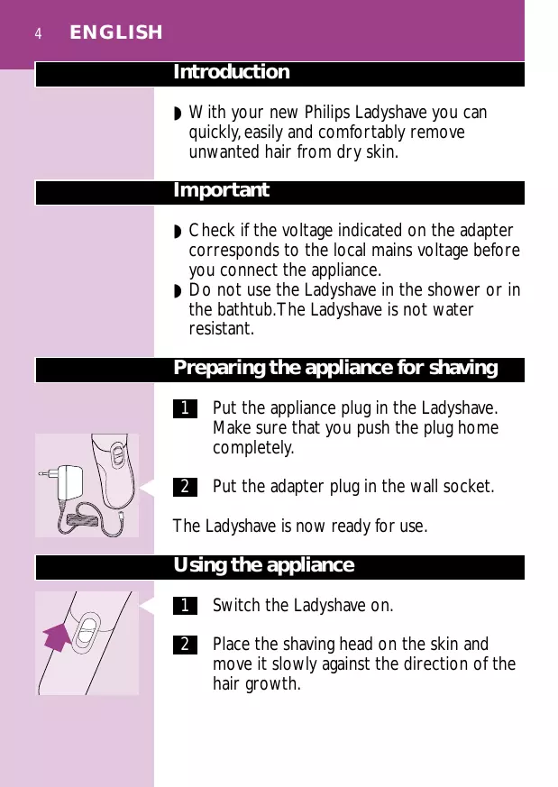 ◗ Ne laissez pas l'appareil Ladyshave en contact avec de l'eau. Ladyshave n'est pas étanche.