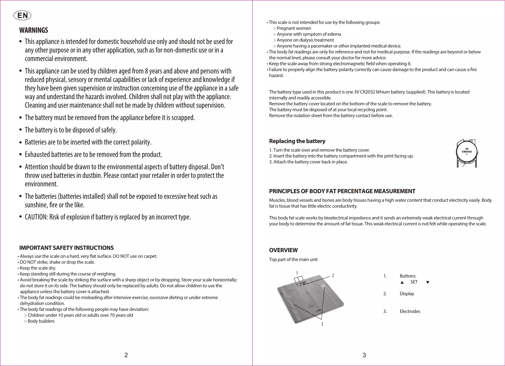• This scale is not intended for use by the following groups: > Pregnant women > Anyone with symptom of edema > Anyone on dialysis treatment > Anyone having a pacemaker or other implanted medical device. • The body fat readings are only for reference and not for medical purpose. If the readings are beyond or below the normal level, please consult your doctor for more advice. • Keep the scale away from strong electromagnetic field when operating it. • Failure to properly align the battery polarity correctly can cause damage to the product and can cause a fire hazard. The battery type used in this product is one 3V CR2032 lithium battery (supplied). This battery is located internally and readily accessible. Remove the battery cover located on the bottom of the scale to remove the battery. The battery must be disposed of at your local recycling point. Remove the isolation sheet from the battery contact before use.