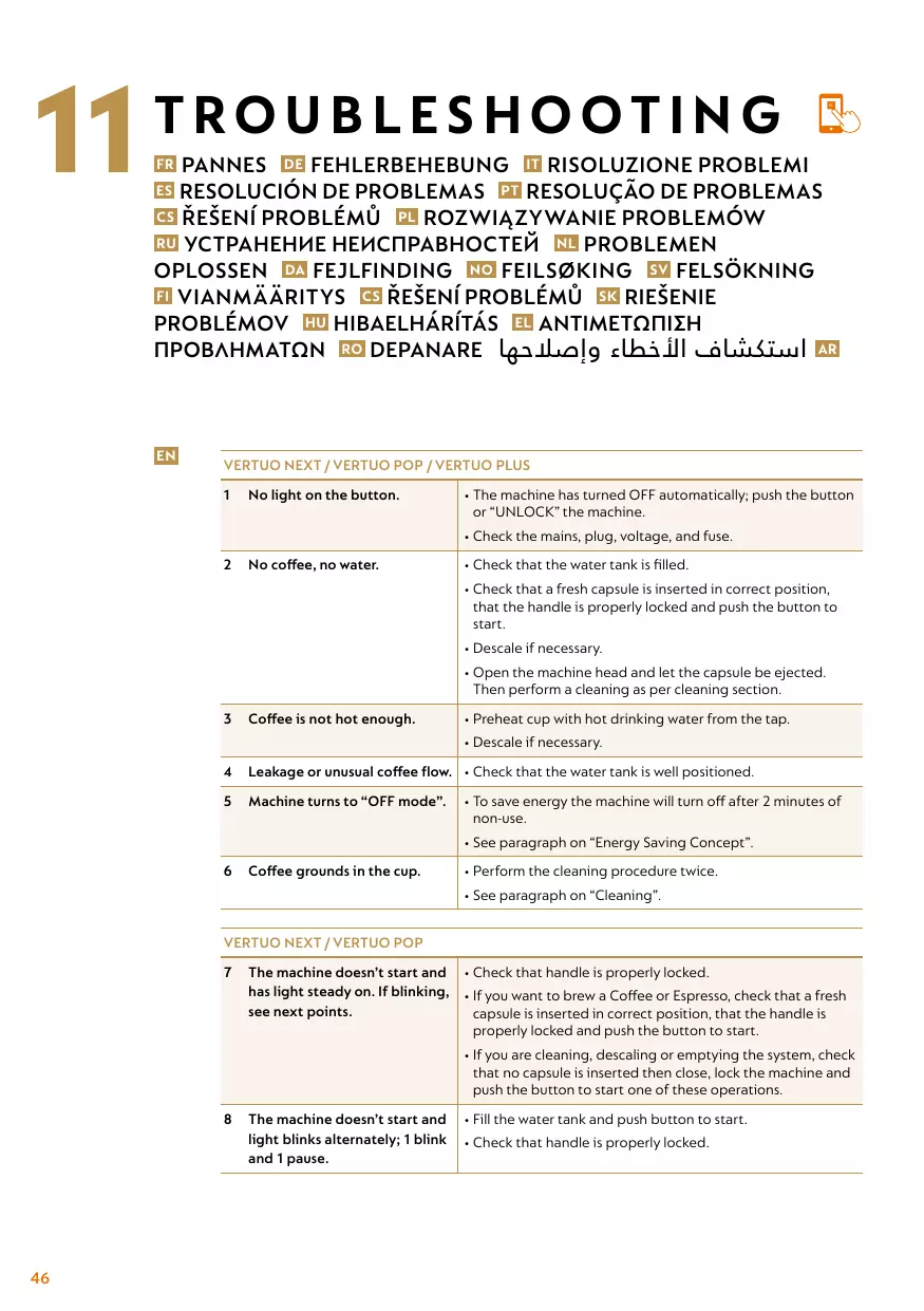 he machine doesn’t start and • Check that handle is properly locked. T has light steady on. If blinking, • If you want to brew a Coffee or Espresso, check that a fresh see next points. capsule is inserted in correct position, that the handle is properly locked and push the button to start. • If you are cleaning, descaling or emptying the system, check that no capsule is inserted then close, lock the machine and push the button to start one of these operations.