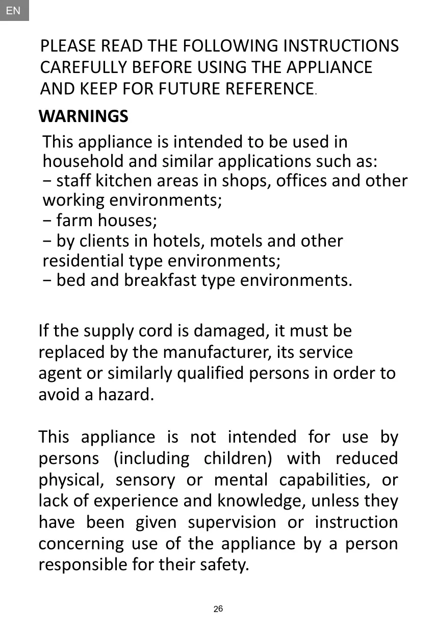 AND KEEP FOR FUTURE REFERENCE. WARNINGS This appliance is intended to be used in household and similar applications such as: − staff kitchen areas in shops, offices and other working environments; − farm houses; − by clients in hotels, motels and other residential type environments; − bed and breakfast type environments. If the supply cord is damaged, it must be replaced by the manufacturer, its service agent or similarly qualified persons in order to avoid a hazard. This appliance is not intended for use by persons (including children) with reduced physical, sensory or mental capabilities, or lack of experience and knowledge, unless they have been given supervision or instruction concerning use of the appliance by a person responsible for their safety.