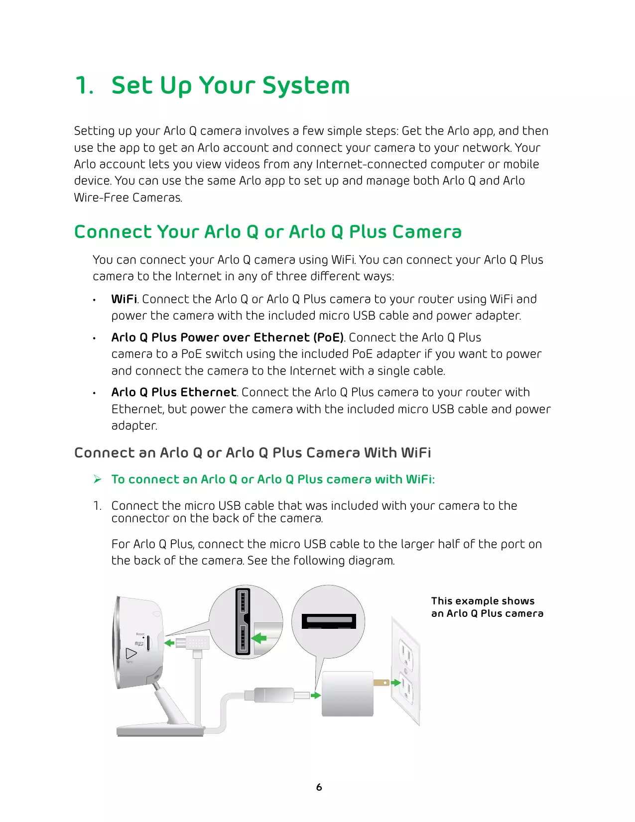 WiFi. Connect the Arlo Q or Arlo Q Plus camera to your router using WiFi and power the camera with the included micro USB cable and power adapter.