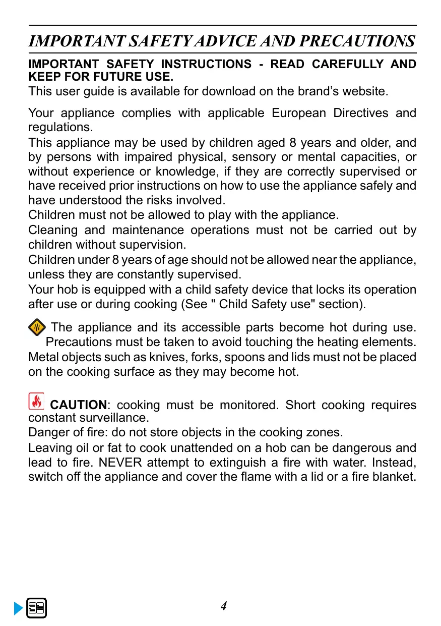 Your appliance complies with applicable European Directives and regulations. This appliance may be used by children aged 8 years and older, and by persons with impaired physical, sensory or mental capacities, or without experience or knowledge, if they are correctly supervised or have received prior instructions on how to use the appliance safely and have understood the risks involved. Children must not be allowed to play with the appliance. Cleaning and maintenance operations must not be carried out by children without supervision. Children under 8 years of age should not be allowed near the appliance, unless they are constantly supervised. Your hob is equipped with a child safety device that locks its operation after use or during cooking (See " Child Safety use" section). The appliance and its accessible parts become hot during use. Precautions must be taken to avoid touching the heating elements. Metal objects such as knives, forks, spoons and lids must not be placed on the cooking surface as they may become hot. CAUTION: cooking must be monitored. Short cooking requires constant surveillance. Danger of fire: do not store objects in the cooking zones. Leaving oil or fat to cook unattended on a hob can be dangerous and lead to fire. NEVER attempt to extinguish a fire with water. Instead, switch off the appliance and cover the flame with a lid or a fire blanket.