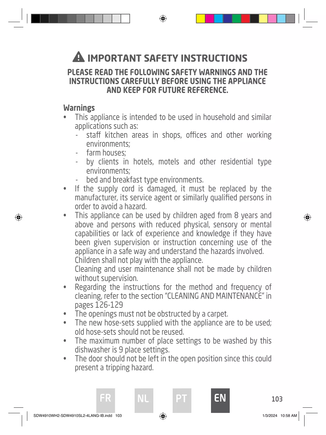 DE PINNEN DICHTKLAPPENp.47 WATERONTHARDER GEBRUIKENp.48 HET GLANSSPOEL- EN VAATWASMIDDELBAKJE GEBRUIKEN...p.50 VAATWASPROGRAMMA’Sp.53 EEN WASCYCLUS STARTENp.55 REINIGING EN ONDERHOUDp.59 PROBLEEMOPLOSSINGp.63 1/3/2024 10:58 AM VOORDAT U UW VAATWASMACHINE INSTALLEERT Controleer voordat u uw vaatwasmachine op de netvoeding aansluit of de spanning op het typeplaatje van uw apparaat overeenstemt met de spanning bij u thuis. Het apparaat moet geaard zijn. De fabrikant is niet verantwoordelijk voor schade die ontstaat door het gebruik zonder aarding. WAARSCHUWING: Sluit de elektrische stroom af voordat u uw vaatwasmachine installeert. EN