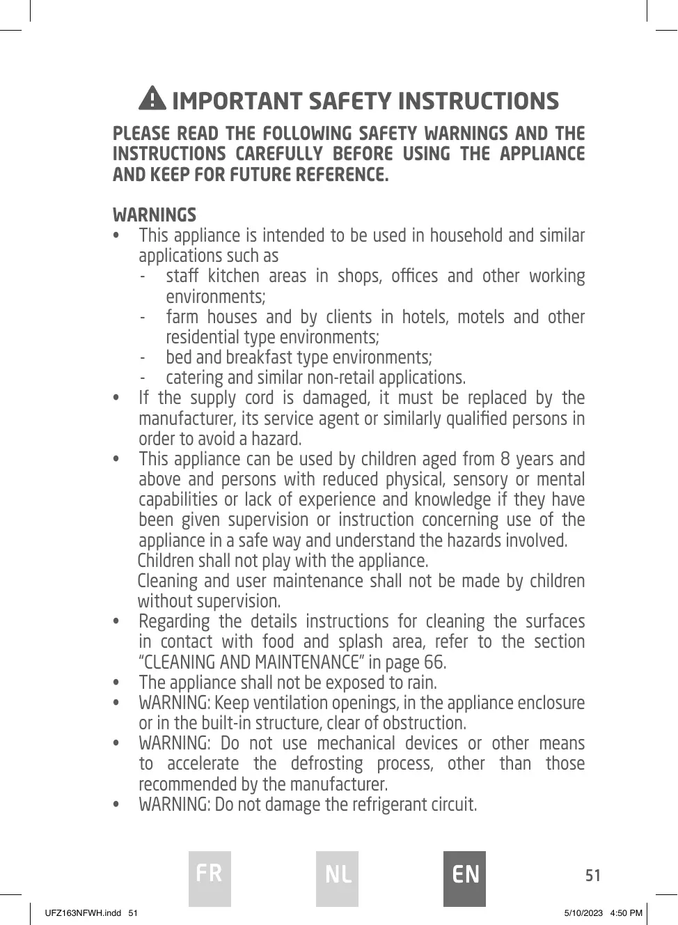 UFZ163NFWH.indd 71 5/10/2023 4:50 PM DISPOSAL As a responsible retailer we care about the environment. As such we urge you to follow the correct disposal procedure for the appliance and packaging materials. This will help conserve natural resources and ensure that it is recycled in a manner that protects health and the environment. You must dispose of this appliance and its packaging according to local laws and regulations. Because this appliance contains electronic components, the appliance and its accessories must be disposed of separately from household waste when the appliance reaches its end of life. Contact your local authority to learn about disposal and recycling. The appliance should be taken to your local collection point for recycling. Some collection points accept appliance free of charge. We apologise for any inconvenience caused by minor inconsistencies in these instructions, which may occur as a result of product improvement and development. Etablissements Darty & fils ©, 9 Rue des Bateaux-Lavoirs, 94200 Ivry-sur-Seine, France 31/08/2023