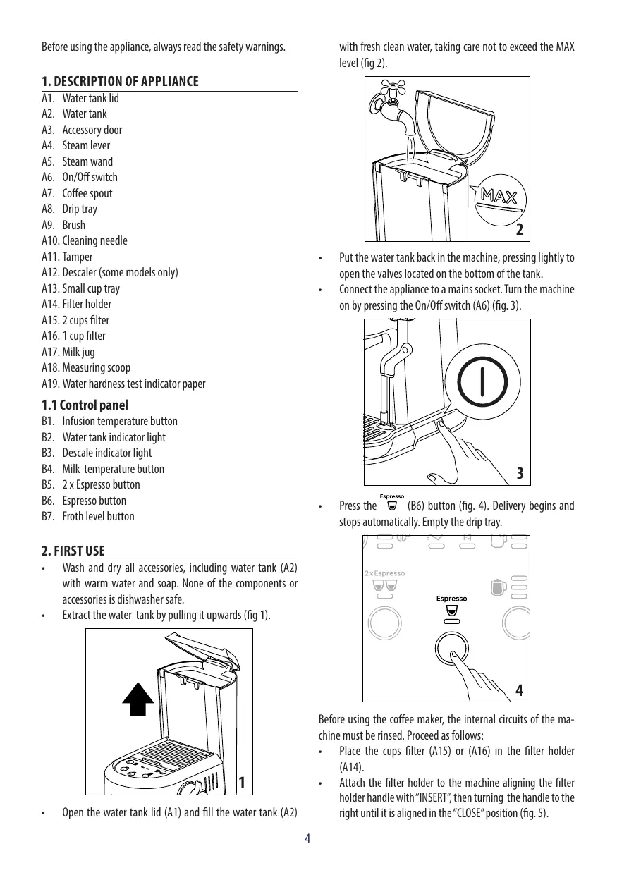 1.1 Panneau de commande B1. B2. Appuyer sur la touche (B6) (fig. 4). La distribution commence et s’arrête automatiquement. Vider le bac égouttoir.