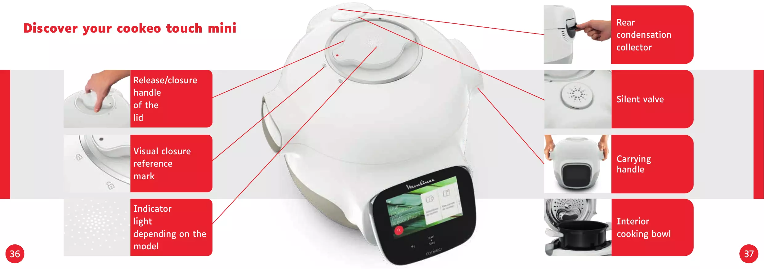 It provides me with lots of recipe ideas in no time at all. The cookeo touch mini has a large touch screen display to show me all the steps to follow. 35 The cookeo touch mini does the cooking for me.