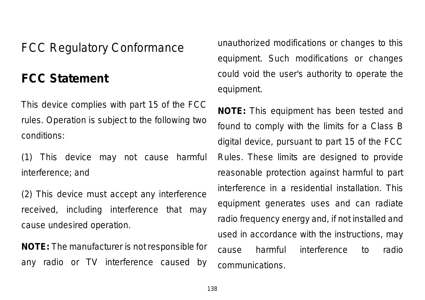 unauthorized modifications or changes to this FCC Regulatory Conformance equipment. Such modifications or changes could void the user's authority to operate the FCC Statement equipment. This device complies with part 15 of the FCC NOTE: This equipment has been tested and rules. Operation is subject to the following two found to comply with the limits for a Class B conditions: digital device, pursuant to part 15 of the FCC (1) This device may not cause harmful Rules. These limits are designed to provide interference; and reasonable protection against harmful to part interference in a residential installation. This (2) This device must accept any interference equipment generates uses and can radiate received, including interference that may radio frequency energy and, if not installed and cause undesired operation. used in accordance with the instructions, may NOTE: The manufacturer is not responsible for cause any radio or TV interference caused by communications.
