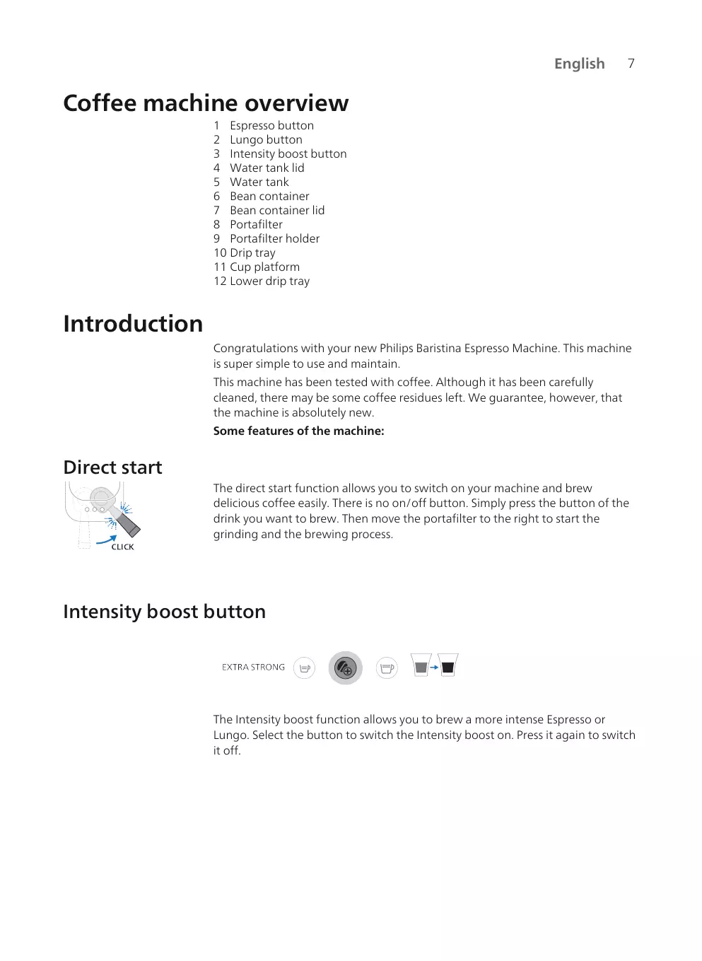 Introduction Congratulations with your new Philips Baristina Espresso Machine. This machine is super simple to use and maintain. This machine has been tested with coffee. Although it has been carefully cleaned, there may be some coffee residues left. We guarantee, however, that the machine is absolutely new. Some features of the machine: