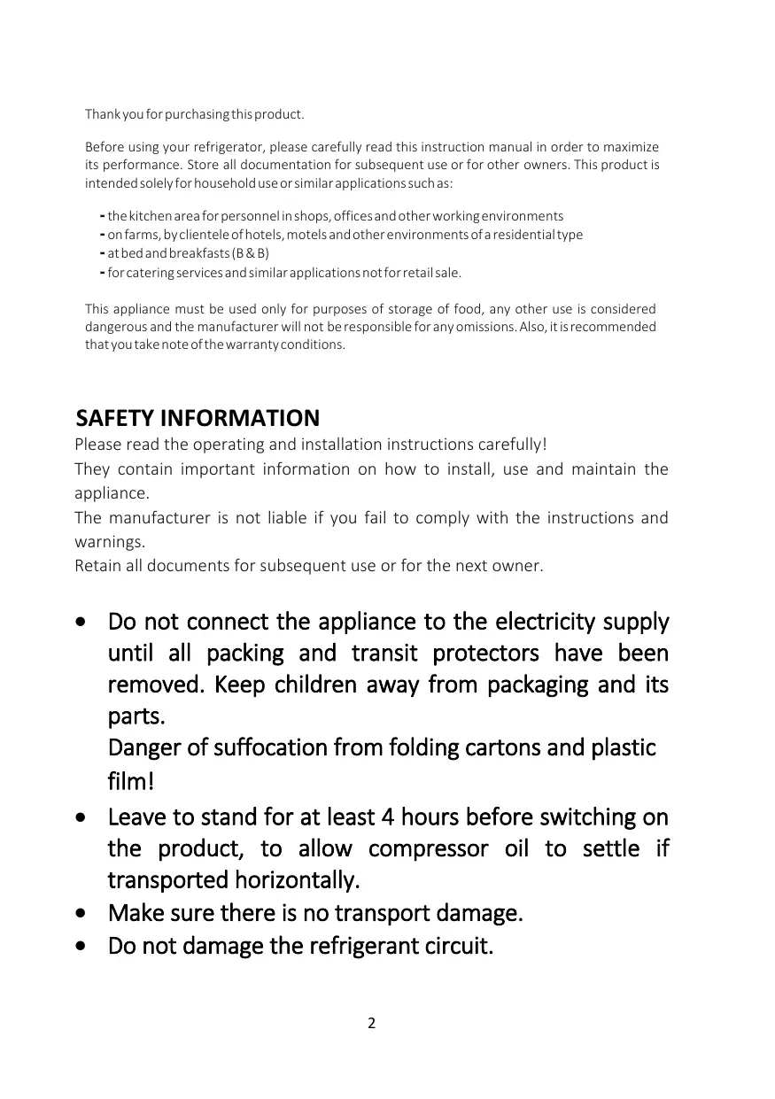 Avant d'utiliser votre réfrigérateur, veuillez lire attentivement ces instructions d'utilisation afin de maximiser ses performances. Conservez cette documentation pour pouvoir vous y référer ultérieurement ou pour les éventuels futurs propriétaires. Ce produit est destiné uniquement à un usage domestique ou autres usages similaires tels que :