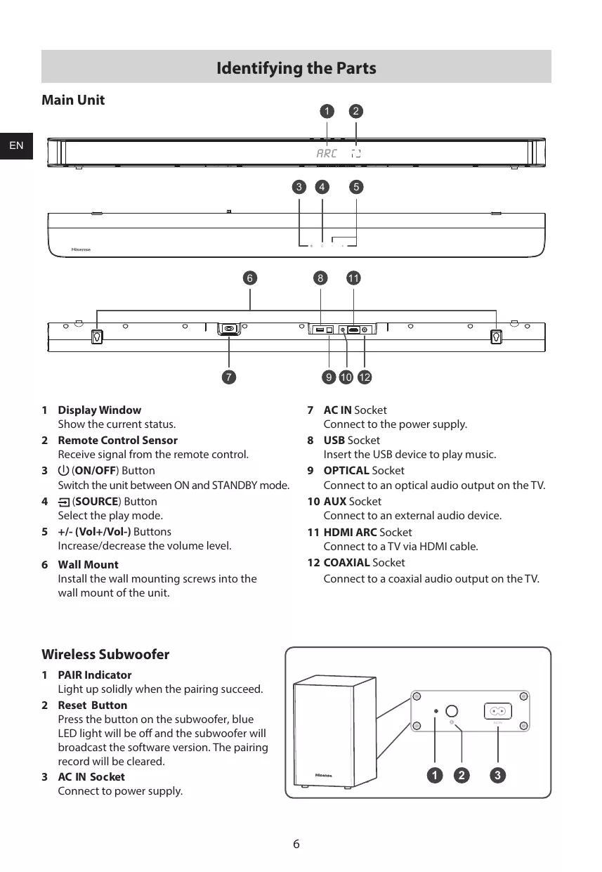 7 AC IN Socket Connect to the power supply. 8 USB Socket Insert the USB device to play music. 9 OPTICAL Socket Connect to an optical audio output on the TV. 10 AUX Socket Connect to an external audio device. 11 HDMI ARC Socket Connect to a TV via HDMI cable. 12 COAXIAL Socket Connect to a coaxial audio output on the TV.