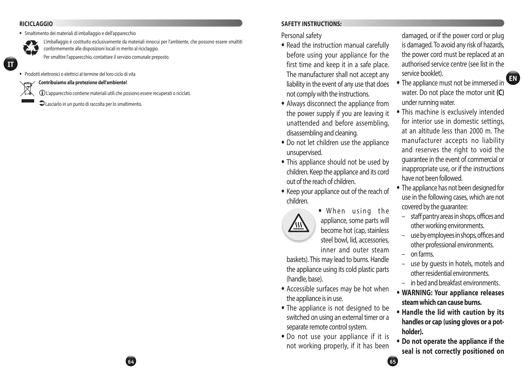 damaged, or if the power cord or plug is damaged. To avoid any risk of hazards, the power cord must be replaced at an authorised service centre (see list in the service booklet). EN • The appliance must not be immersed in water. Do not place the motor unit (C) under running water. • This machine is exclusively intended for interior use in domestic settings, at an altitude less than 2000 m. The manufacturer accepts no liability and reserves the right to void the guarantee in the event of commercial or inappropriate use, or if the instructions have not been followed. • The appliance has not been designed for use in the following cases, which are not covered by the guarantee: – staff pantry areas in shops, offices and other working environments. – use by employees in shops, offices and other professional environments. – on farms. – use by guests in hotels, motels and other residential environments. – in bed and breakfast environments. • WARNING: Your appliance releases steam which can cause burns. • Handle the lid with caution by its handles or cap (using gloves or a potholder). • Do not operate the appliance if the seal is not correctly positioned on 65