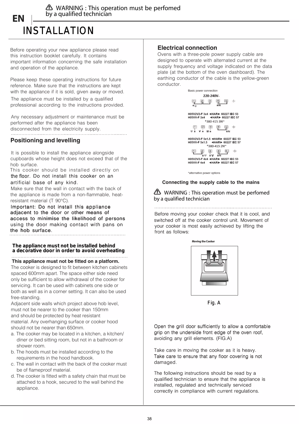 évitant les éléments du gril. (FIG. A) Déplacez la table de cuisson avec précaution car elle est lourde. Veillez à ne pas endommager le revêtement. Les instructions suivantes doivent être lues par un technicien qualifié afin de s'assurer que l'appareil est installé, réglé et entretenu techniquement, correctement et conformément aux réglementations en vigueur.