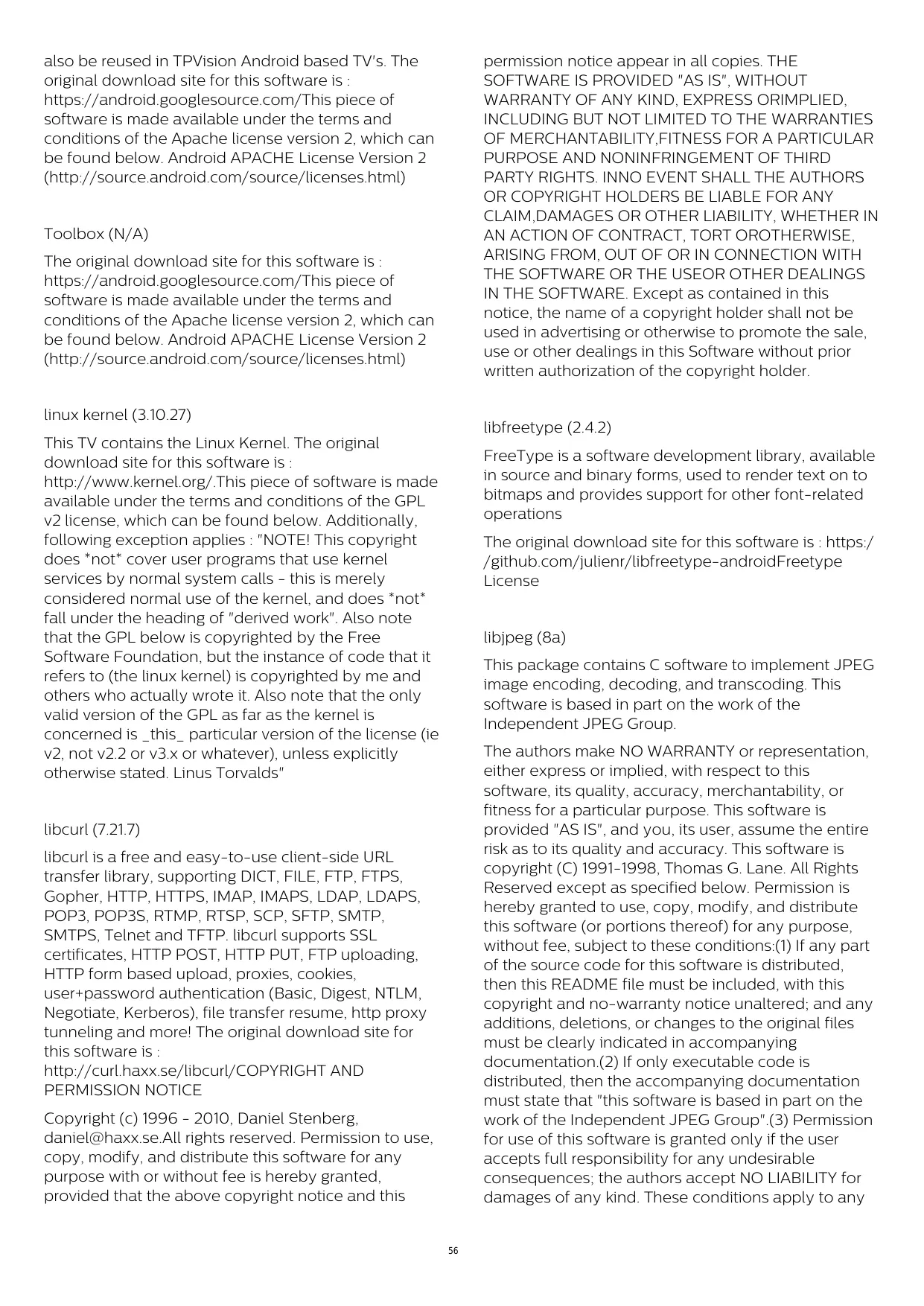 PARTY RIGHTS. INNO EVENT SHALL THE AUTHORS OR COPYRIGHT HOLDERS BE LIABLE FOR ANY CLAIM,DAMAGES OR OTHER LIABILITY, WHETHER IN AN ACTION OF CONTRACT, TORT OROTHERWISE, ARISING FROM, OUT OF OR IN CONNECTION WITH THE SOFTWARE OR THE USEOR OTHER DEALINGS IN THE SOFTWARE. Except as contained in this notice, the name of a copyright holder shall not be used in advertising or otherwise to promote the sale, use or other dealings in this Software without prior written authorization of the copyright holder. Toolbox (N/A) The original download site for this software is : https://android.googlesource.com/This piece of software is made available under the terms and conditions of the Apache license version 2, which can be found below. Android APACHE License Version 2 (http://source.android.com/source/licenses.html) linux kernel (3.10.27) libfreetype (2.4.2) This TV contains the Linux Kernel. The original download site for this software is : http://www.kernel.org/.This piece of software is made available under the terms and conditions of the GPL v2 license, which can be found below. Additionally, following exception applies : "NOTE! This copyright does *not* cover user programs that use kernel services by normal system calls - this is merely considered normal use of the kernel, and does *not* fall under the heading of "derived work". Also note that the GPL below is copyrighted by the Free Software Foundation, but the instance of code that it refers to (the linux kernel) is copyrighted by me and others who actually wrote it. Also note that the only valid version of the GPL as far as the kernel is concerned is _this_ particular version of the license (ie v2, not v2.2 or v3.x or whatever), unless explicitly otherwise stated. Linus Torvalds" FreeType is a software development library, available in source and binary forms, used to render text on to bitmaps and provides support for other font-related operations The original download site for this software is : https:/ /github.com/julienr/libfreetype-androidFreetype License libjpeg (8a) This package contains C software to implement JPEG image encoding, decoding, and transcoding. This software is based in part on the work of the Independent JPEG Group. The authors make NO WARRANTY or representation, either express or implied, with respect to this software, its quality, accuracy, merchantability, or fitness for a particular purpose. This software is provided "AS IS", and you, its user, assume the entire risk as to its quality and accuracy. This software is copyright (C) 1991-1998, Thomas G. Lane. All Rights Reserved except as specified below. Permission is hereby granted to use, copy, modify, and distribute this software (or portions thereof) for any purpose, without fee, subject to these conditions:(1) If any part of the source code for this software is distributed, then this README file must be included, with this copyright and no-warranty notice unaltered; and any additions, deletions, or changes to the original files must be clearly indicated in accompanying documentation.(2) If only executable code is distributed, then the accompanying documentation must state that "this software is based in part on the work of the Independent JPEG Group".(3) Permission for use of this software is granted only if the user accepts full responsibility for any undesirable consequences; the authors accept NO LIABILITY for damages of any kind. These conditions apply to any libcurl (7.21.7) libcurl is a free and easy-to-use client-side URL transfer library, supporting DICT, FILE, FTP, FTPS, Gopher, HTTP, HTTPS, IMAP, IMAPS, LDAP, LDAPS, POP3, POP3S, RTMP, RTSP, SCP, SFTP, SMTP, SMTPS, Telnet and TFTP. libcurl supports SSL certificates, HTTP POST, HTTP PUT, FTP uploading, HTTP form based upload, proxies, cookies, user+password authentication (Basic, Digest, NTLM, Negotiate, Kerberos), file transfer resume, http proxy tunneling and more! The original download site for this software is : http://curl.haxx.se/libcurl/COPYRIGHT AND PERMISSION NOTICE Copyright (c) 1996 - 2010, Daniel Stenberg, daniel@haxx.se.All rights reserved. Permission to use, copy, modify, and distribute this software for any purpose with or without fee is hereby granted, provided that the above copyright notice and this