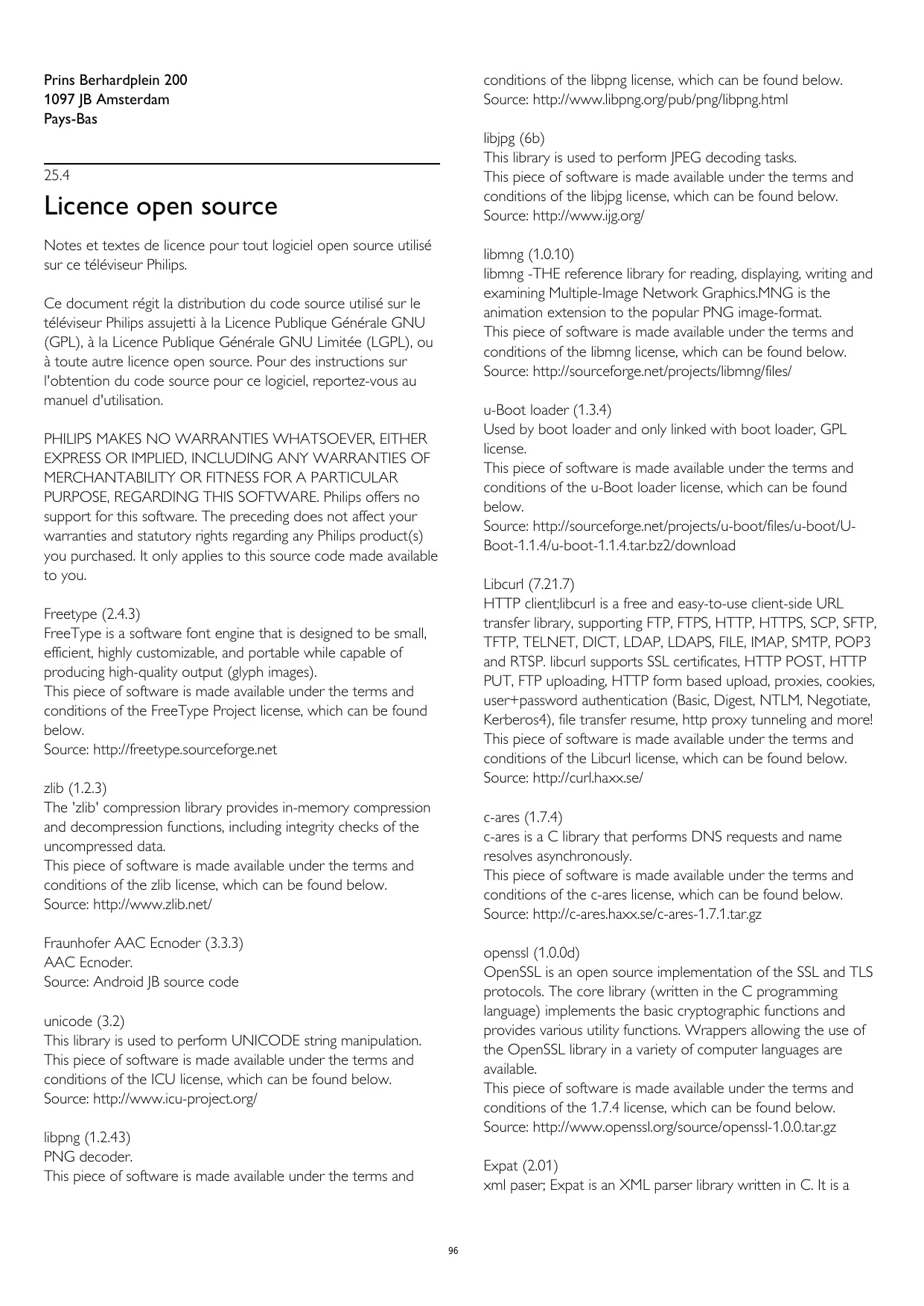PURPOSE, REGARDING THIS SOFTWARE. Philips offers no support for this software. The preceding does not affect your warranties and statutory rights regarding any Philips product(s) you purchased. It only applies to this source code made available to you. Libcurl (7.21.7) HTTP client;libcurl is a free and easy-to-use client-side URL transfer library, supporting FTP, FTPS, HTTP, HTTPS, SCP, SFTP, TFTP, TELNET, DICT, LDAP, LDAPS, FILE, IMAP, SMTP, POP3 and RTSP. libcurl supports SSL certificates, HTTP POST, HTTP PUT, FTP uploading, HTTP form based upload, proxies, cookies, user+password authentication (Basic, Digest, NTLM, Negotiate, Kerberos4), file transfer resume, http proxy tunneling and more! This piece of software is made available under the terms and conditions of the Libcurl license, which can be found below. Source: http://curl.haxx.se/ Freetype (2.4.3) FreeType is a software font engine that is designed to be small, efficient, highly customizable, and portable while capable of producing high-quality output (glyph images). This piece of software is made available under the terms and conditions of the FreeType Project license, which can be found below. Source: http://freetype.sourceforge.net zlib (1.2.3) The 'zlib' compression library provides in-memory compression and decompression functions, including integrity checks of the uncompressed data. This piece of software is made available under the terms and conditions of the zlib license, which can be found below. Source: http://www.zlib.net/ c-ares (1.7.4) c-ares is a C library that performs DNS requests and name resolves asynchronously. This piece of software is made available under the terms and conditions of the c-ares license, which can be found below. Source: http://c-ares.haxx.se/c-ares-1.7.1.tar.gz Fraunhofer AAC Ecnoder (3.3.3) AAC Ecnoder. Source: Android JB source code openssl (1.0.0d) OpenSSL is an open source implementation of the SSL and TLS protocols. The core library (written in the C programming language) implements the basic cryptographic functions and provides various utility functions. Wrappers allowing the use of the OpenSSL library in a variety of computer languages are available. This piece of software is made available under the terms and conditions of the 1.7.4 license, which can be found below. Source: http://www.openssl.org/source/openssl-1.0.0.tar.gz unicode (3.2) This library is used to perform UNICODE string manipulation. This piece of software is made available under the terms and conditions of the ICU license, which can be found below. Source: http://www.icu-project.org/ libpng (1.2.43) PNG decoder. This piece of software is made available under the terms and Expat (2.01) xml paser; Expat is an XML parser library written in C. It is a
