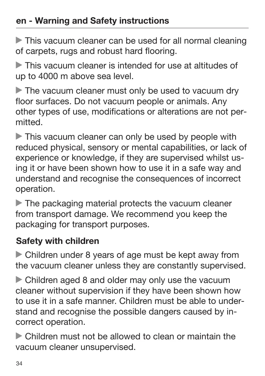 en - Warning and Safety instructions This vacuum cleaner can be used for all normal cleaning of carpets, rugs and robust hard flooring. This vacuum cleaner is intended for use at altitudes of up to 4000 m above sea level. The vacuum cleaner must only be used to vacuum dry floor surfaces. Do not vacuum people or animals. Any other types of use, modifications or alterations are not permitted. This vacuum cleaner can only be used by people with reduced physical, sensory or mental capabilities, or lack of experience or knowledge, if they are supervised whilst using it or have been shown how to use it in a safe way and understand and recognise the consequences of incorrect operation. The packaging material protects the vacuum cleaner from transport damage. We recommend you keep the packaging for transport purposes. Safety with children Children under 8 years of age must be kept away from the vacuum cleaner unless they are constantly supervised. Children aged 8 and older may only use the vacuum cleaner without supervision if they have been shown how to use it in a safe manner. Children must be able to understand and recognise the possible dangers caused by incorrect operation. Children must not be allowed to clean or maintain the vacuum cleaner unsupervised. 34