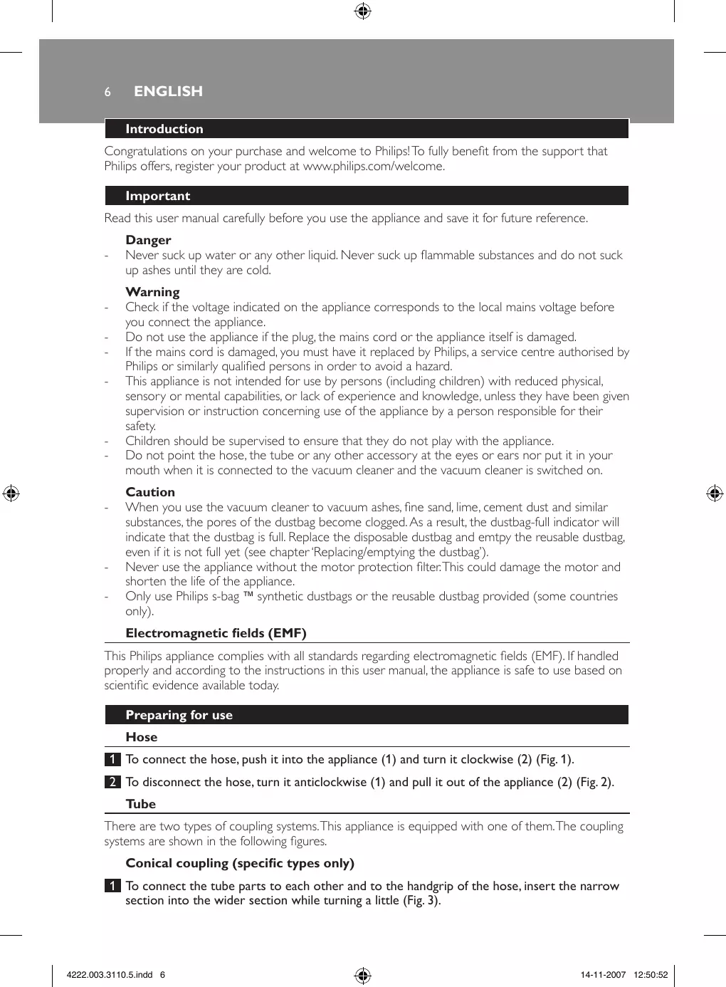 Danger Never suck up water or any other liquid. Never suck up flammable substances and do not suck up ashes until they are cold. Warning Check if the voltage indicated on the appliance corresponds to the local mains voltage before you connect the appliance. Do not use the appliance if the plug, the mains cord or the appliance itself is damaged. If the mains cord is damaged, you must have it replaced by Philips, a service centre authorised by Philips or similarly qualified persons in order to avoid a hazard. This appliance is not intended for use by persons (including children) with reduced physical, sensory or mental capabilities, or lack of experience and knowledge, unless they have been given supervision or instruction concerning use of the appliance by a person responsible for their safety. Children should be supervised to ensure that they do not play with the appliance. Do not point the hose, the tube or any other accessory at the eyes or ears nor put it in your mouth when it is connected to the vacuum cleaner and the vacuum cleaner is switched on. Caution When you use the vacuum cleaner to vacuum ashes, fine sand, lime, cement dust and similar substances, the pores of the dustbag become clogged. As a result, the dustbag-full indicator will indicate that the dustbag is full. Replace the disposable dustbag and emtpy the reusable dustbag, even if it is not full yet (see chapter ‘Replacing/emptying the dustbag’). Never use the appliance without the motor protection filter. This could damage the motor and shorten the life of the appliance. Only use Philips s-bag ` synthetic dustbags or the reusable dustbag provided (some countries only). Electromagnetic fields (EMF)