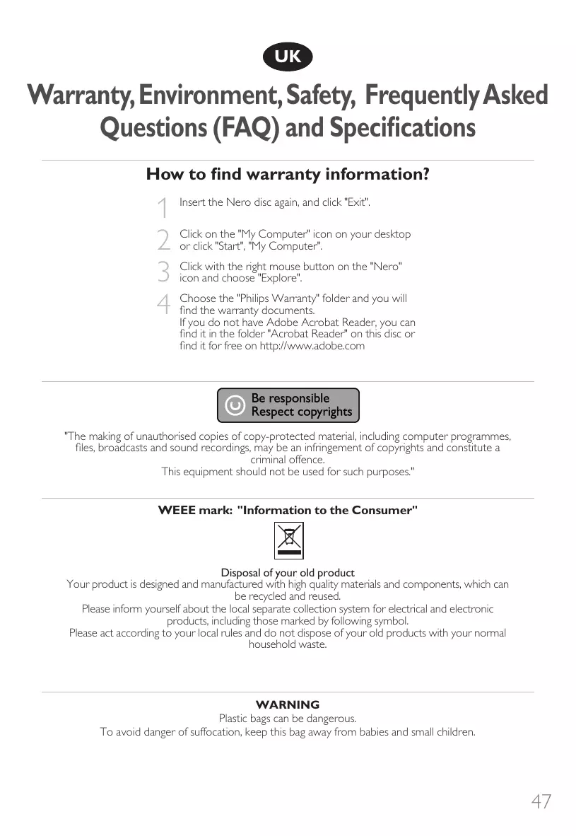 8x on DVD+RW 16x on DVD-R 4x on DVD-R Dual Layer 6x on DVD-RW The actual write speed may be lower as this is disc dependent. Maximum read speeds: 48x on CD 16x on DVD The SPD3000CC reads following discs: CD / CD-R / CD-RW formats both 8cm & 12cm discs (up to 99 min). Cliquez avec le bouton droit sur l’icône "Nero" et choisissez "Explorer". Choisissez le dossier "Philips Warranty" : vous y trouverez les documents relatifs à la garantie. Si vous n'avez pas Adobe Acrobat Reader, vous le trouverez dans le dossier Acrobat Reader de ce disque. Il est également disponible gratuitement à l'adresse http://www.adobe.com.