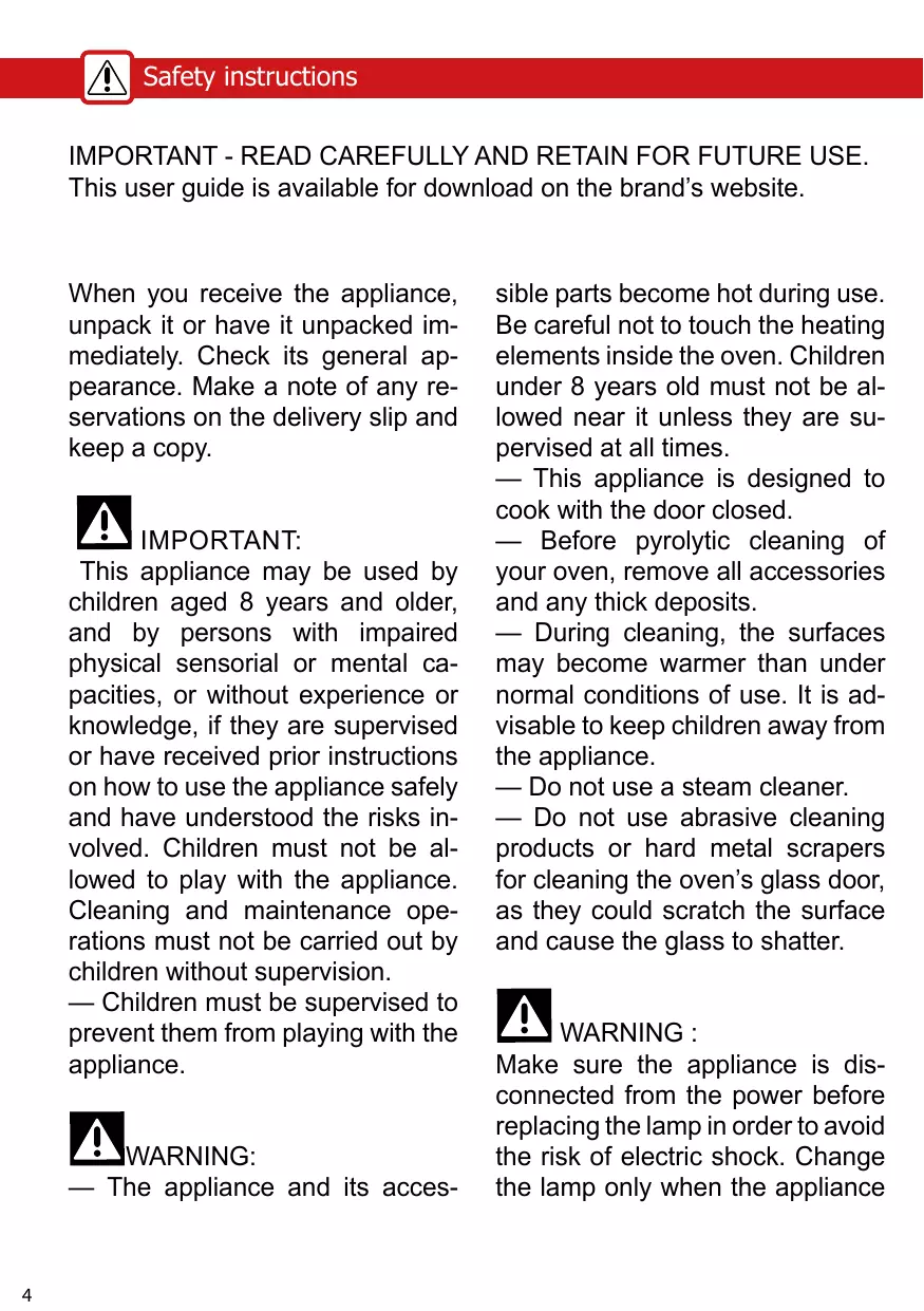 sible parts become hot during use. Be careful not to touch the heating elements inside the oven. Children under 8 years old must not be allowed near it unless they are supervised at all times. — This appliance is designed to cook with the door closed. — Before pyrolytic cleaning of your oven, remove all accessories and any thick deposits. — During cleaning, the surfaces may become warmer than under normal conditions of use. It is advisable to keep children away from the appliance. — Do not use a steam cleaner. — Do not use abrasive cleaning products or hard metal scrapers for cleaning the oven’s glass door, as they could scratch the surface and cause the glass to shatter. WARNING : Make sure the appliance is disconnected from the power before replacing the lamp in order to avoid the risk of electric shock. Change the lamp only when the appliance