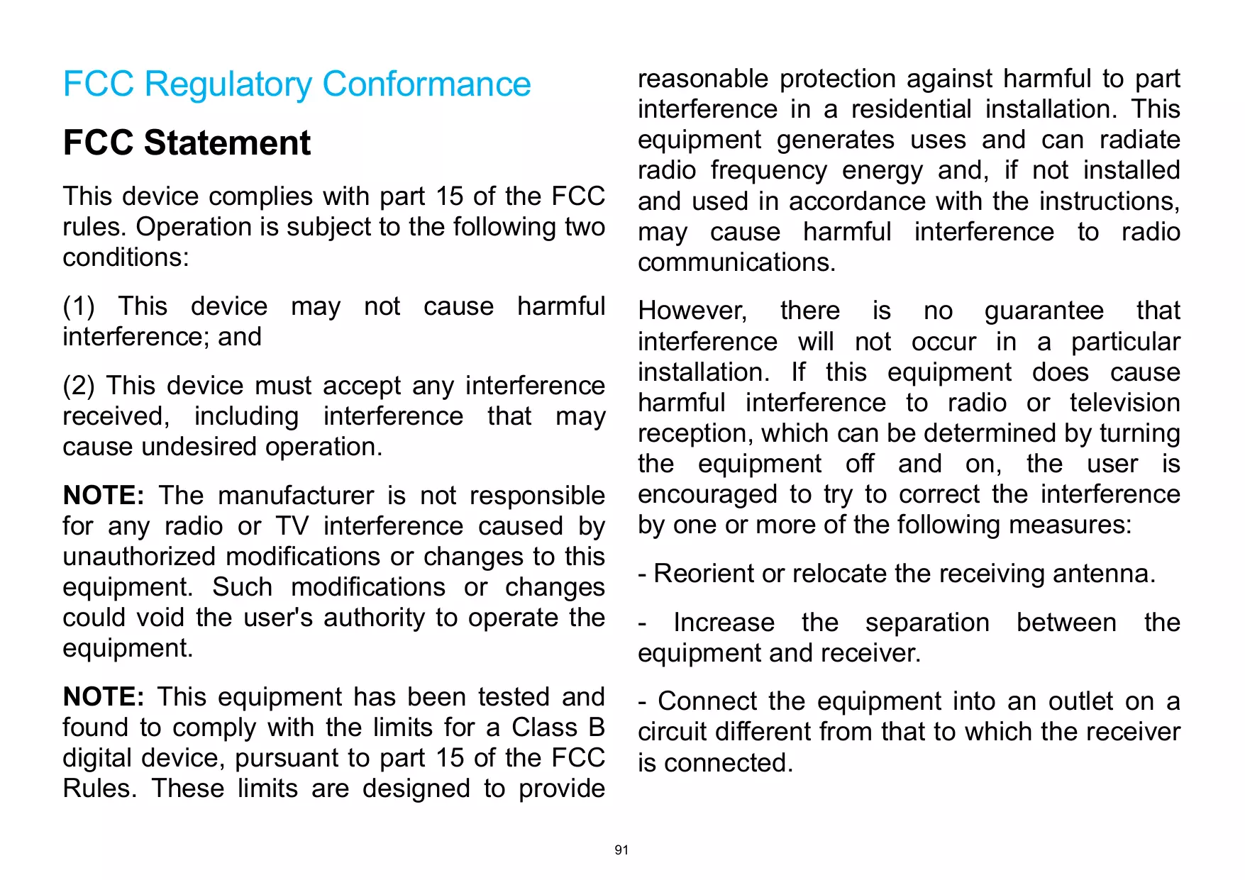 reasonable protection against harmful to part interference in a residential installation. This equipment generates uses and can radiate radio frequency energy and, if not installed and used in accordance with the instructions, may cause harmful interference to radio communications. FCC Regulatory Conformance FCC Statement This device complies with part 15 of the FCC rules. Operation is subject to the following two conditions: (1) This device may not cause harmful interference; and However, there is no guarantee that interference will not occur in a particular installation. If this equipment does cause harmful interference to radio or television reception, which can be determined by turning the equipment off and on, the user is encouraged to try to correct the interference by one or more of the following measures: (2) This device must accept any interference received, including interference that may cause undesired operation. NOTE: The manufacturer is not responsible for any radio or TV interference caused by unauthorized modifications or changes to this equipment. Such modifications or changes could void the user's authority to operate the equipment. - Reorient or relocate the receiving antenna. - Increase the separation equipment and receiver. NOTE: This equipment has been tested and found to comply with the limits for a Class B digital device, pursuant to part 15 of the FCC Rules. These limits are designed to provide between the - Connect the equipment into an outlet on a circuit different from that to which the receiver is connected.