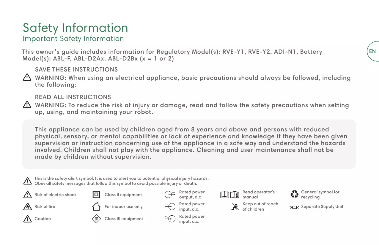 ull firmly on the wheel to remove it from P its housing (see illustration below). Remove any debris from inside the wheel cavity. FR Ce guide du propriétaire comprend des renseignements sur les modèles de réglementation : RVE-Y1, RVE-Y2, ADI-N1, Batterie : ABL-F, ABL-D2Ax, ABL-D2Bx (x = 1 or 2) CONSERVER CES INSTRUCTIONS AVERTISSEMENT : lorsque vous utilisez un appareil électrique, vous devez respecter certaines précautions de base, notamment : LISEZ TOUTES LES INSTRUCTIONS AVERTISSEMENT: pour éviter tout risque de blessure ou de dommage, lisez et respectez les consignes de sécurité suivantes lors de la configuration, de l’utilisation et de l’entretien de votre robot. Cet appareil peut être utilisé par des enfants âgés de 8 ans et plus, et par des personnes ayant des capacités physiques, sensorielles ou mentales réduites, ou un manque d’expérience et de connaissances, si des conseils ou instructions leur ont été donnés concernant l’utilisation en toute sécurité de l’appareil et les dangers impliqués. Les enfants ne doivent pas jouer avec l’appareil. Le nettoyage et l’entretien par l’utilisateur ne doivent pas être effectués par des enfants sans surveillance. Voici le symbole d’alerte de sécurité. Il est utilisé pour vous informer d’éventuels risques de blessure. Respectez tous les messages de sécurité qui suivent ce symbole afin d’éviter tout risque de blessure ou de mort. Risque d’électrocution