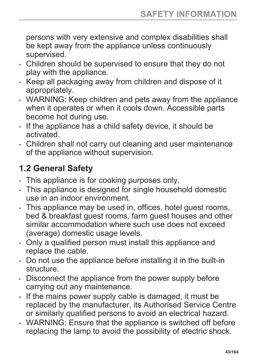 This appliance is for cooking purposes only. This appliance is designed for single household domestic use in an indoor environment. This appliance may be used in, offices, hotel guest rooms, bed & breakfast guest rooms, farm guest houses and other similar accommodation where such use does not exceed (average) domestic usage levels. Only a qualified person must install this appliance and replace the cable. Do not use the appliance before installing it in the built-in structure. Disconnect the appliance from the power supply before carrying out any maintenance. If the mains power supply cable is damaged, it must be replaced by the manufacturer, its Authorised Service Centre or similarly qualified persons to avoid an electrical hazard. WARNING: Ensure that the appliance is switched off before replacing the lamp to avoid the possibility of electric shock. 43/164