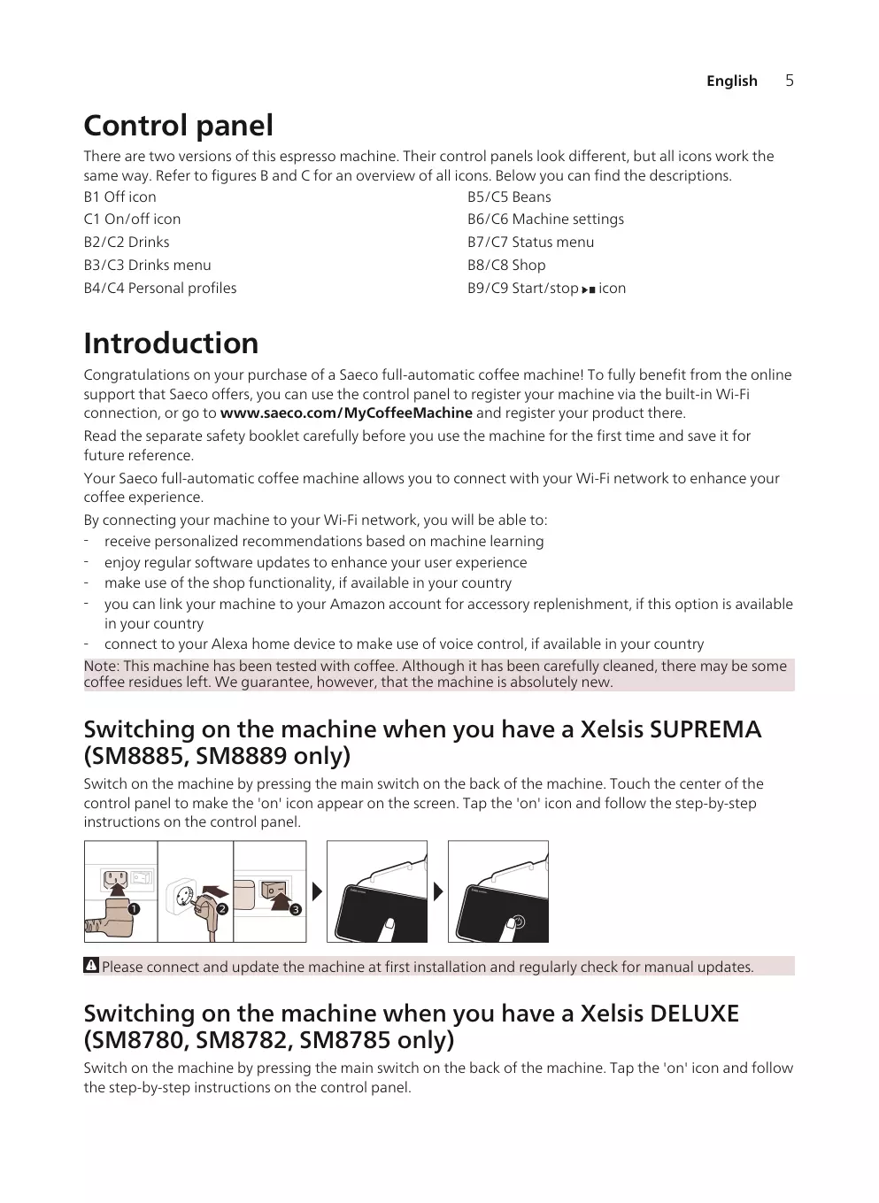 B6/C6 Machine settings (Paramètres de la machine) C1 On/off icon (Icône marche/arrêt) B2/C2 Drinks (Boissons) Votre machine à café Saeco entièrement automatique vous permet de vous connecter à votre réseau Wi-Fi pour une expérience optimale. En connectant votre machine à votre réseau Wi-Fi, vous pourrez : - recevoir des recommandations personnalisées basées sur l’apprentissage machine ; - bénéficier de mises à jour logicielles régulières pour améliorer votre expérience utilisateur ; - accéder à la boutique (sous réserve de disponibilité dans votre pays) ; - associer votre machine à votre compte Amazon (sous réserve de disponibilité dans votre pays) pour vos réapprovisionnements en accessoires ; - vous connecter à votre appareil Alexa et commander vocalement votre machine (sous réserve de disponibilité dans votre pays). Remarque : Cette machine a été testée avec du café. Bien qu'elle ait été soigneusement nettoyée, il se peut que quelques résidus de café subsistent. Nous garantissons néanmoins que la machine est entièrement neuve.