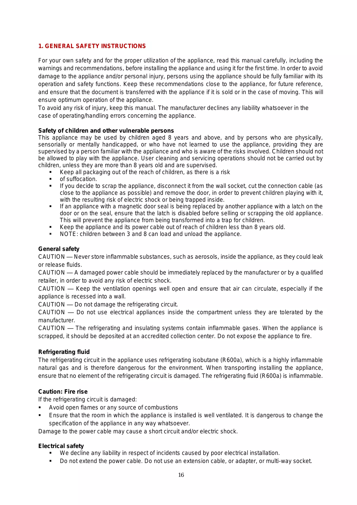 ATTENTION — N’utilisez pas d’appareils électriques à l’intérieur du compartiment, sauf si ces derniers sont tolérés par le fabricant. ATTENTION — Le système réfrigérant et isolant contiennent des gaz inflammables. Lorsque vous mettez l’appareil au rebut, faites-le auprès d’un centre de collecte agréé. N’exposez jamais l’appareil aux flammes. Liquide réfrigérant De l’isobutane réfrigérant (R600a) est utilisé dans le circuit réfrigérant de l’appareil ; Il s’agit d’un gaz naturel hautement inflammable, et donc dangereux pour l’environnement. Pendant les transports et l’installation de l’appareil, vérifiez qu’aucun des composants du circuit de réfrigération ne soit endommagé. Le réfrigérant 1