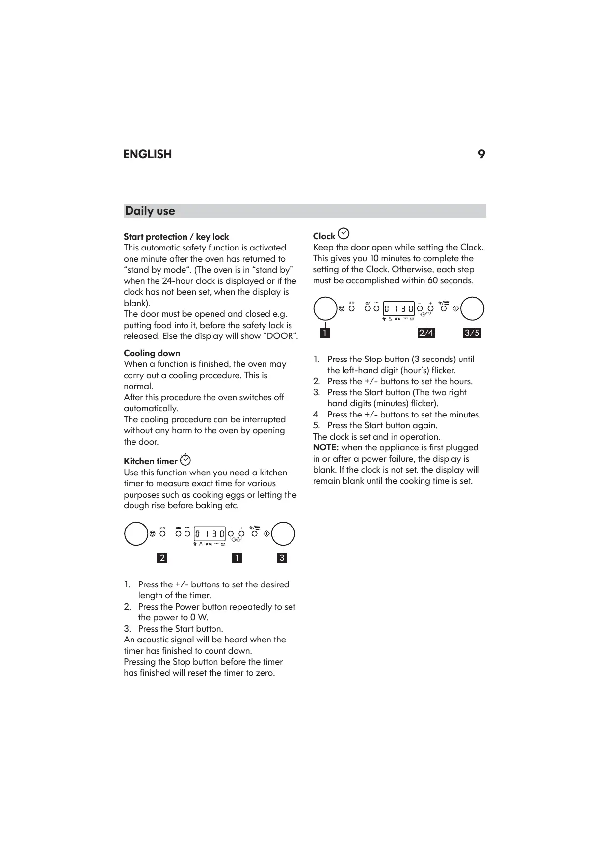 Daily use Start protection / key lock This automatic safety function is activated one minute after the oven has returned to “stand by mode“. (The oven is in “stand by” when the 24-hour clock is displayed or if the clock has not been set, when the display is blank). The door must be opened and closed e.g. putting food into it, before the safety lock is released. Else the display will show “DOOR”. Cooling down When a function is finished, the oven may carry out a cooling procedure. This is normal. After this procedure the oven switches off automatically. The cooling procedure can be interrupted without any harm to the oven by opening the door. Kitchen timer Use this function when you need a kitchen timer to measure exact time for various purposes such as cooking eggs or letting the dough rise before baking etc.