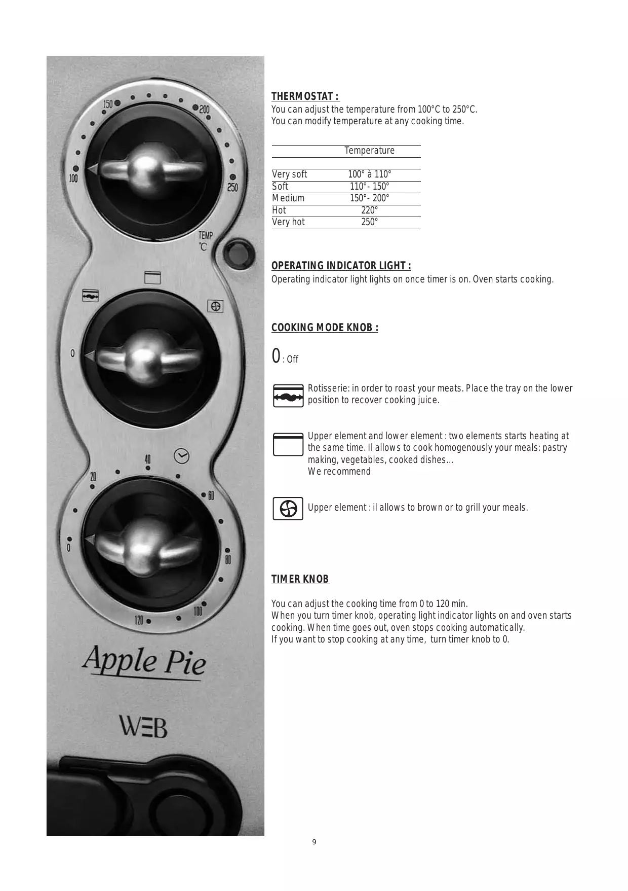 You can adjust the cooking time from 0 to 120min When you turn timer knob, operating light indicator lights on and oven starts cooking. When time goes out, oven stops cooking automatically.