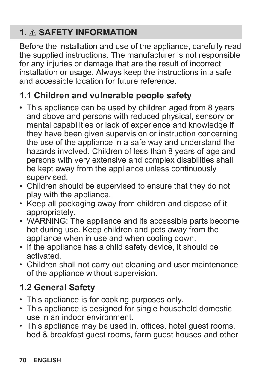 1. INFORMATION SUR LA SÉCURITÉ 103 2. CONSIGNES DE SÉCURITÉ105 3. DESCRIPTION DE L'APPAREIL108 4. BANDEAU DE COMMANDE109 5. AVANT LA PREMIÈRE UTILISATION 110 6. UTILISATION QUOTIDIENNE 112 7. FONCTIONS DE L'HORLOGE117 8. UTILISATION DES ACCESSOIRES118 9. FONCTIONS SUPPLÉMENTAIRES 120 10. CONSEILS 122 11. ENTRETIEN ET NETTOYAGE 125 1.1 Sécurité des enfants et des personnes vulnérables • Cet appareil peut être utilisé par des enfants âgés d'au moins 8 ans et par des personnes ayant des capacités physiques, sensorielles ou mentales réduites ou dénuées d’expérience ou de connaissance, s'ils sont correctement surveillés ou si des instructions relatives à l'utilisation de l'appareil en toute sécurité leur ont été données et s’ils comprennent les risques encourus. Les enfants de moins de 8 ans et les personnes ayant un handicap très important et complexe doivent être tenus à l'écart de l’appareil, à moins d'être surveillés en permanence. • Veillez à ce que les enfants ne jouent pas avec l’appareil. • Ne laissez pas les emballages à la portée des enfants et jetez-les convenablement. • AVERTISSEMENT : L'appareil et ses parties accessibles deviennent chauds pendant l'utilisation. Tenez les enfants et les animaux éloignés de l’appareil lorsqu’il est en cours d’utilisation et de refroidissement. • Si l'appareil est équipé d'un dispositif de sécurité enfants, nous vous recommandons de l'activer. • Le nettoyage et l'entretien par l'usager ne doivent pas être effectués par des enfants sans surveillance.