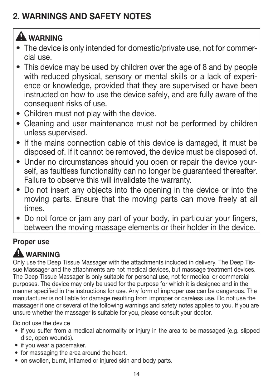 • Cet appareil peut être utilisé par les enfants à partir de 8 ans ainsi que les déficients physiques sensoriels ou mentaux et les personnes ayant peu de connaissances ou d’expérience à la condition qu’ils soient surveillés ou sachent comment l’utiliser en toute sécurité et en comprennent les risques. • Les enfants ne doivent pas jouer avec cet appareil. • Le nettoyage et l’entretien ne doivent pas être effectués par des enfants sans surveillance. • Si le câble d’alimentation électrique de l’appareil est endommagé, il doit être mis au rebut. S’il n’est pas détachable, l’appareil doit être mis au rebut. • Vous ne devez en aucun cas ouvrir ou réparer l’appareil ; le bon fonctionnement de l’appareil ne serait plus assuré. Le non-respect de cette consigne annulerait la garantie. • N’insérer aucun objet dans l’ouverture de l’appareil et ne rien glisser dans les parties mobiles. Assurez-vous que les parties mobiles sont toujours libres de mouvement. • Ne coincez ou n’insérez aucune partie de votre corps, en particulier les doigts, entre les éléments de massage mobiles de l’appareil ou dans leur emplacement. Utilisation conforme aux recommandations