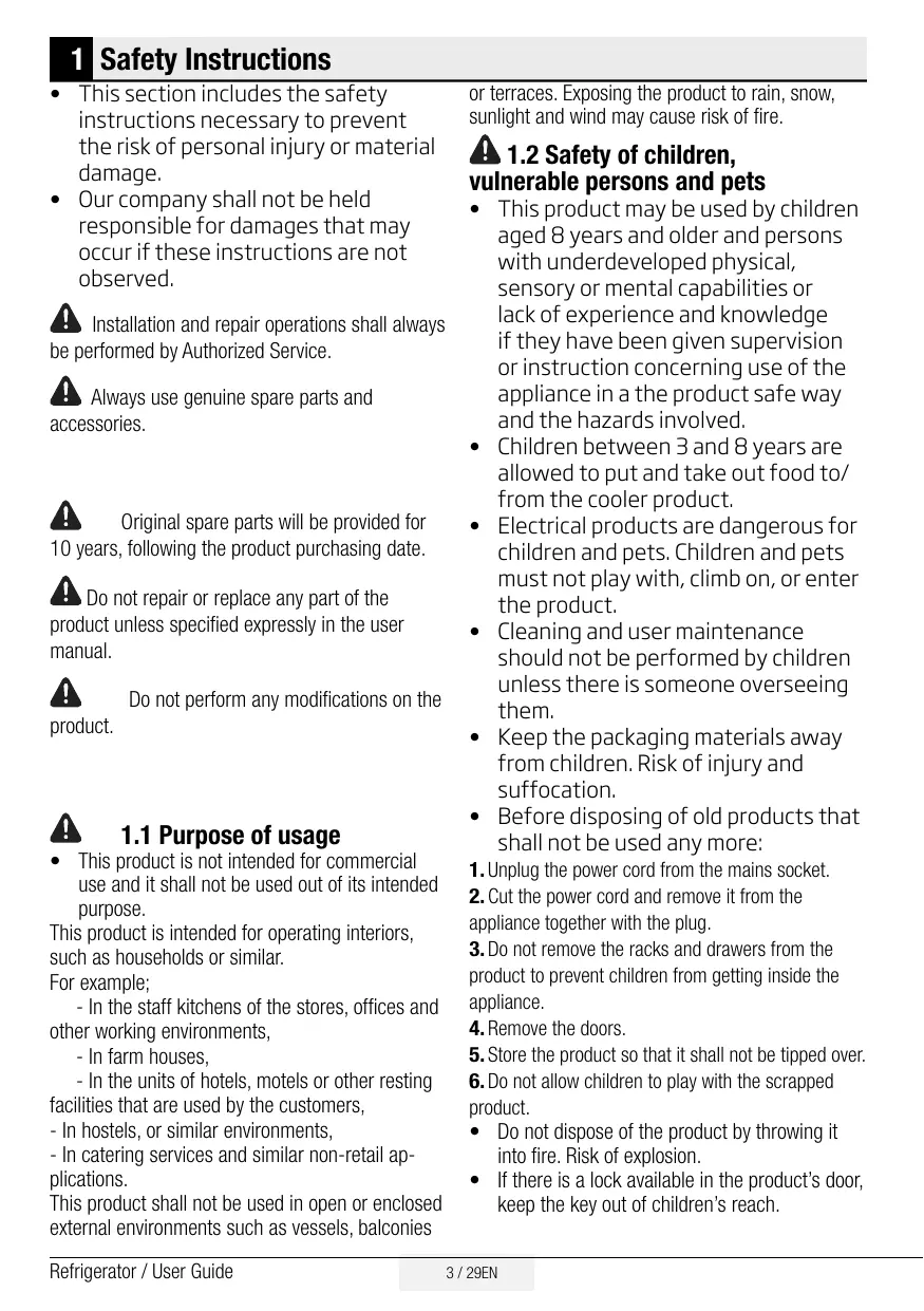 Pour cette raison, excepté pour les parties indiquées à la section « Je veux réparer moi-même » qui peuvent être réparées par les utilisateurs finaux, une réparation par une station d’entretien agrée est certainement suggérée afin d’éviter tout problème de sécurité et cela est nécessaire pour que la garantie du produit Beko se poursuive. JE VEUX ME RÉPARER Les réparations qui seront effectuées par les utilisateurs finaux peuvent être exécutées avec les pièces de rechange suivantes : Poignées de porte et charnières de porte, joints de porte et plateaux périphériques, paniers, supports. (Vous pouvons consulter la liste à jour des pièces de rechange à partir de l’adresse : https://www.beko.com.tr/destek à compter du 1er mars 2021.) En outre, afin d’assurer la sécurité du produit et de prévenir les risques de blessures graves, les réparations doivent être effectuées conformément aux instructions du manuel de l’utilisateur ou du site https://www.beko.com.tr/destek. Pour votre propre sécurité, veuillez débrancher l’appareil avant d’effectuer toute réparation. Beko ne peut être tenu responsable des problèmes de sécurité qui peuvent survenir en raison de réparations ou de tentatives de réparation qui ne sont pas effectuées conformément aux instructions indiquées dans les manuels d’utilisation ou figurant sur le site : https://www.beko.com.tr/destek et effectué sur des pièces autres que celles contenues dans la liste à jour des pièces, accessible à partir de l’adresse : https://www.beko.com.tr/destek. Dans ce cas, la garantie du produit Beko sera invalide. Pour cette raison, nous recommandons vivement aux utilisateurs finaux d’éviter d’effectuer des réparations pour des pièces autres que les celles mentionnées ci-dessus et de s’adresser à une station de service autorisée en cas de besoin. De telles tentatives de la part des utilisateurs finaux peuvent causer des problèmes de sécurité, endommager le l’appareil et causer un incendie, une inondation, une électrocution et des blessures corporelles graves par la suite.