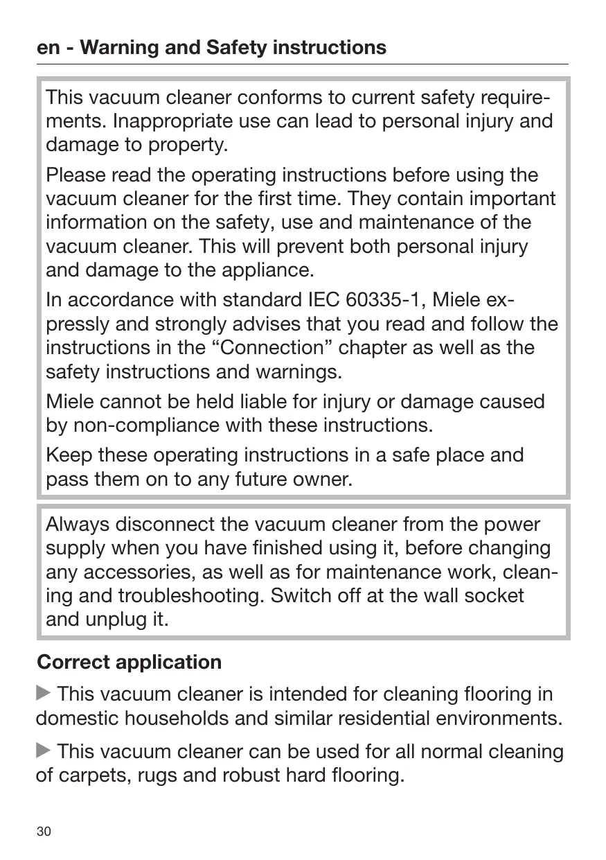 73 Conformément à la norme CEI 60335-1, Miele indique expressément de lire impérativement le chapitre « Raccordement » et de suivre les consignes de sécurité et de mise en garde. Miele ne peut être tenu pour responsable des dommages dus au non-respect des consignes. Conservez ce mode d'emploi et veuillez le remettre en cas de cession de cet appareil. Eteignez toujours l'aspirateur après utilisation et avant de le nettoyer, de changer d'accessoire, de résoudre une anomalie ou si vous souhaitez procéder à une opération de maintenance. Débranchez la fiche de la prise secteur. Utilisation conforme Cet aspirateur est destiné à une utilisation à la maison ou de type domestique. Cet aspirateur est conçu pour l'aspiration quotidienne des tapis, moquettes et sols durs peu fragiles. Cet aspirateur ne doit pas être utilisé en extérieur. 56