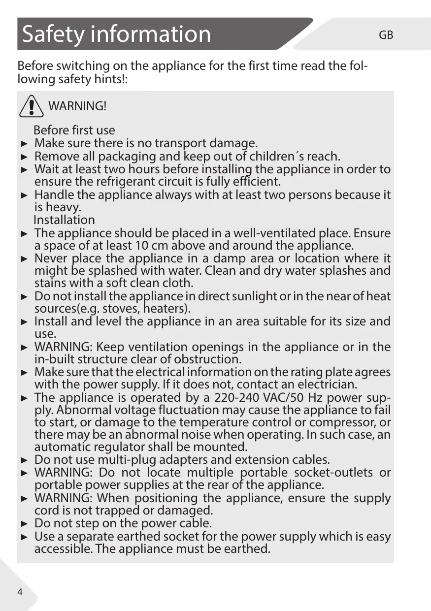 GB Before switching on the appliance for the first time read the following safety hints!: WARNING! Before first use ▶ Make sure there is no transport damage. ▶ Remove all packaging and keep out of children´s reach. ▶ Wait at least two hours before installing the appliance in order to ensure the refrigerant circuit is fully efficient. ▶ Handle the appliance always with at least two persons because it is heavy. Installation ▶ The appliance should be placed in a well-ventilated place. Ensure a space of at least 10 cm above and around the appliance. ▶ Never place the appliance in a damp area or location where it might be splashed with water. Clean and dry water splashes and stains with a soft clean cloth. ▶ Do not install the appliance in direct sunlight or in the near of heat sources(e.g. stoves, heaters). ▶ Install and level the appliance in an area suitable for its size and use. ▶ WARNING: Keep ventilation openings in the appliance or in the in-built structure clear of obstruction. ▶ Make sure that the electrical information on the rating plate agrees with the power supply. If it does not, contact an electrician. ▶ The appliance is operated by a 220-240 VAC/50 Hz power supply. Abnormal voltage fluctuation may cause the appliance to fail to start, or damage to the temperature control or compressor, or there may be an abnormal noise when operating. In such case, an automatic regulator shall be mounted. ▶ Do not use multi-plug adapters and extension cables. ▶ WARNING: Do not locate multiple portable socket-outlets or portable power supplies at the rear of the appliance. ▶ WARNING: When positioning the appliance, ensure the supply cord is not trapped or damaged. ▶ Do not step on the power cable. ▶ Use a separate earthed socket for the power supply which is easy accessible. The appliance must be earthed. 4